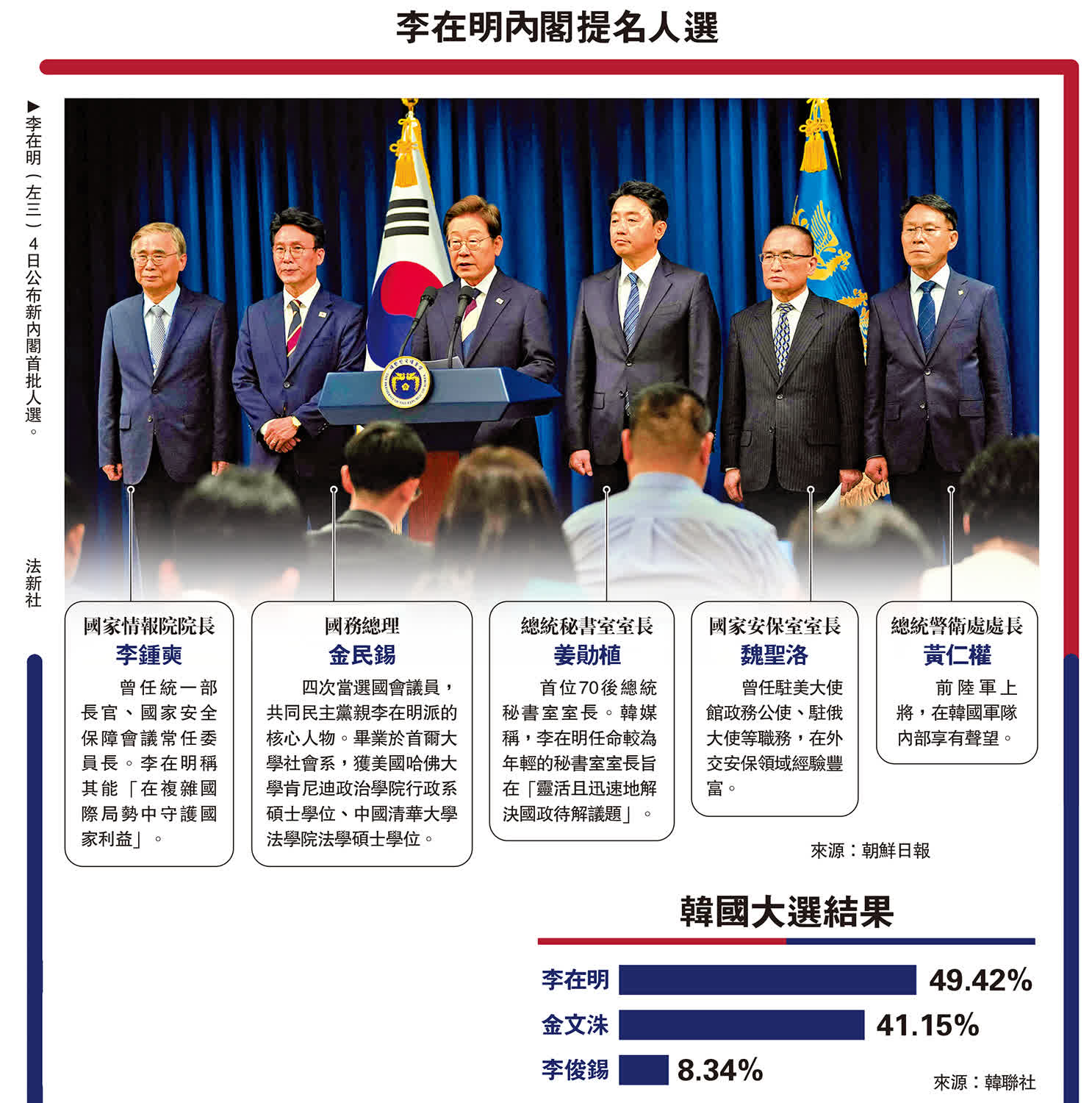 李在明4日公布新內閣首批人選,提名共同民主黨最高委員會委員、親李在明派核心人物金民錫為國務總理。金民錫擁有美國哈佛大學肯尼迪政治學院行政系碩士學位,以及中國清華大學法學院法學碩士學位。李在明還提名前統一部長官李鍾奭為國家情報院院長、議員姜勛植為總統秘書室室長、議員魏聖洛為國家安保室室長、前陸軍上將黃仁權為總統警衛處處長。
