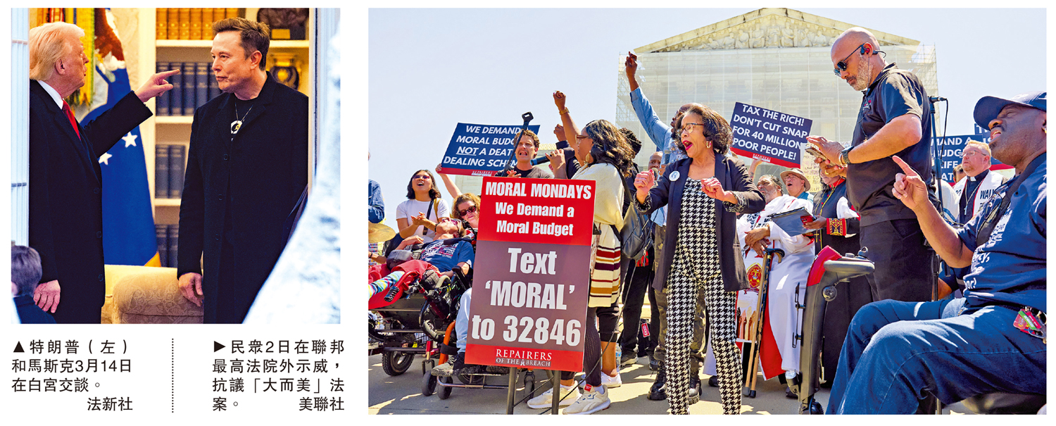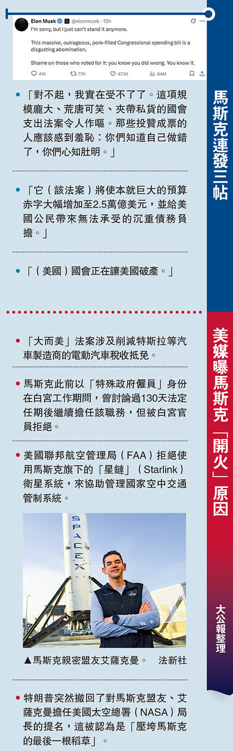 大公報綜合報道,當地時間3日,特斯拉行政總裁(CEO)馬斯克在X平台上連發3篇帖文,痛批特朗普政府的「大而美」法案「令人作嘔」,(美國)國會正在讓美國破產,而投票支持該法案的議員「可恥」。就在馬斯克「開火」後翌日,美國國會預算辦公室4日公布的最新數據顯示,該法案將在未來十年讓美國聯邦政府債務在36.2萬億美元基礎上增加2.4萬億美元。