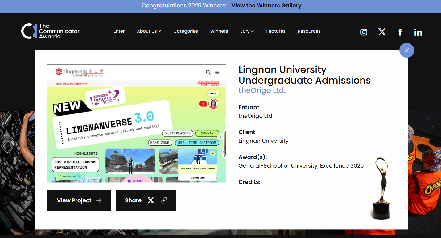 嶺南大學(嶺大)教務處推出的全新本科入學網站,在2025年度第31屆「年度傳訊大獎」(Communicator Awards)中榮獲最高殊榮「卓越獎」(Award of Excellence)。此項國際殊榮由業界權威組織「國際互動與視覺藝術學院」(Academy of Interactive & Visual Arts, AIVA)評選頒發,使嶺大與Netflix、NASA、Apple及華特迪士尼公司等國際知名品牌一同登上本年度的獲獎名單。