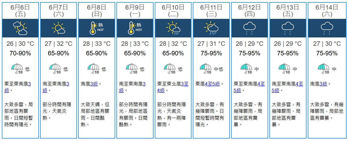 此外,周末起氣溫明顯上升,預測本周六(7日)最高32度,部分時間有陽光,天氣炎熱;下到周日及周一(8日及9日)最高33度,日間酷熱,新界再高一兩度,周日大致天晴,但局部地區有驟雨,周一部分時間有陽光,局部地區有驟雨。