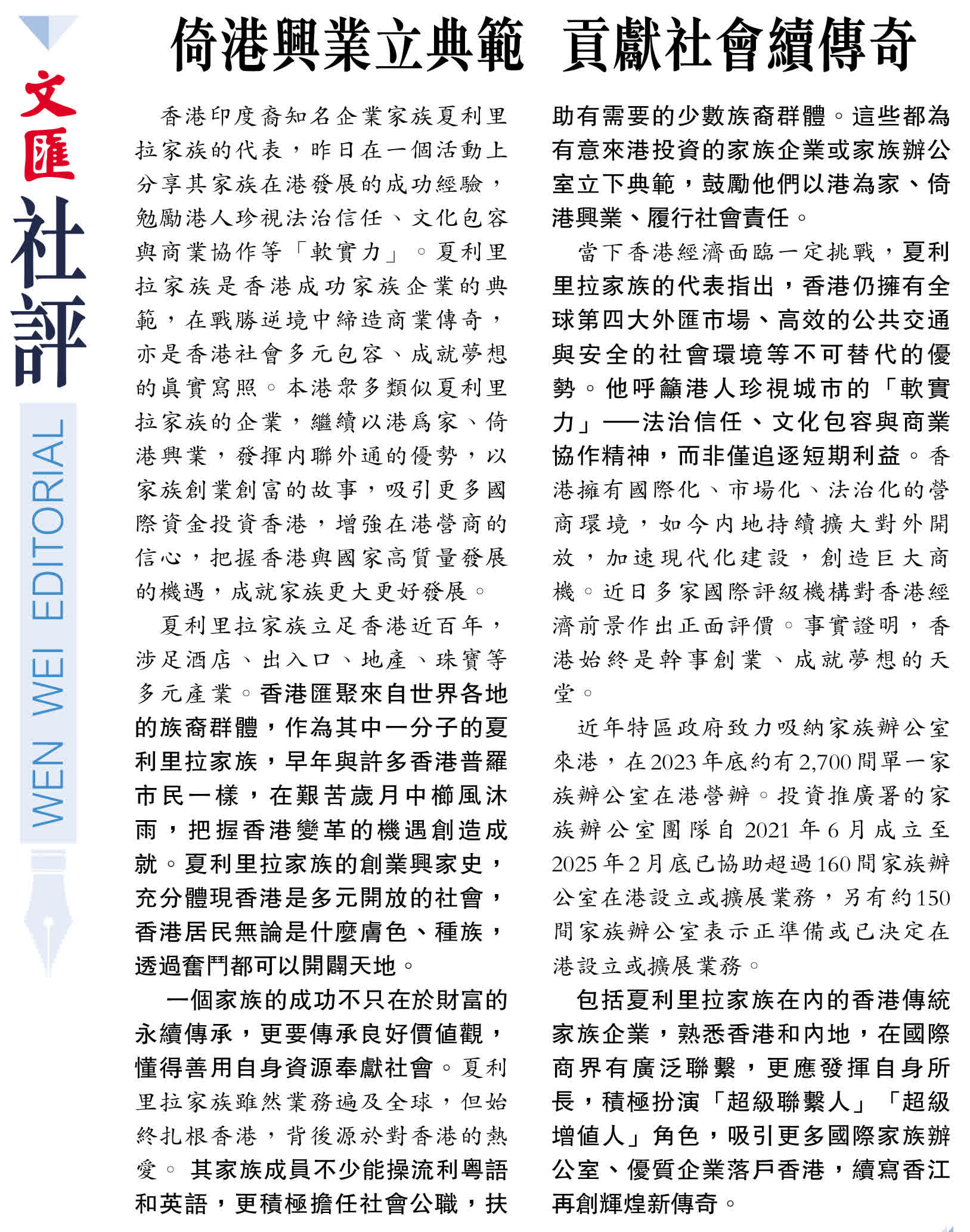 香港印度裔知名企業家族夏利里拉家族的代表,昨日在一個活動上分享其家族在港發展的成功經驗,勉勵港人珍視法治信任、文化包容與商業協作等「軟實力」。夏利里拉家族是香港成功家族企業的典範,在戰勝逆境中締造商業傳奇,亦是香港社會多元包容、成就夢想的真實寫照。本港眾多類似夏利里拉家族的企業,繼續以港為家、倚港興業,發揮內聯外通的優勢,以家族創業創富的故事,吸引更多國際資金投資香港,增強在港營商的信心,把握香港與國家高質量發展的機遇,成就家族更大更好發展。