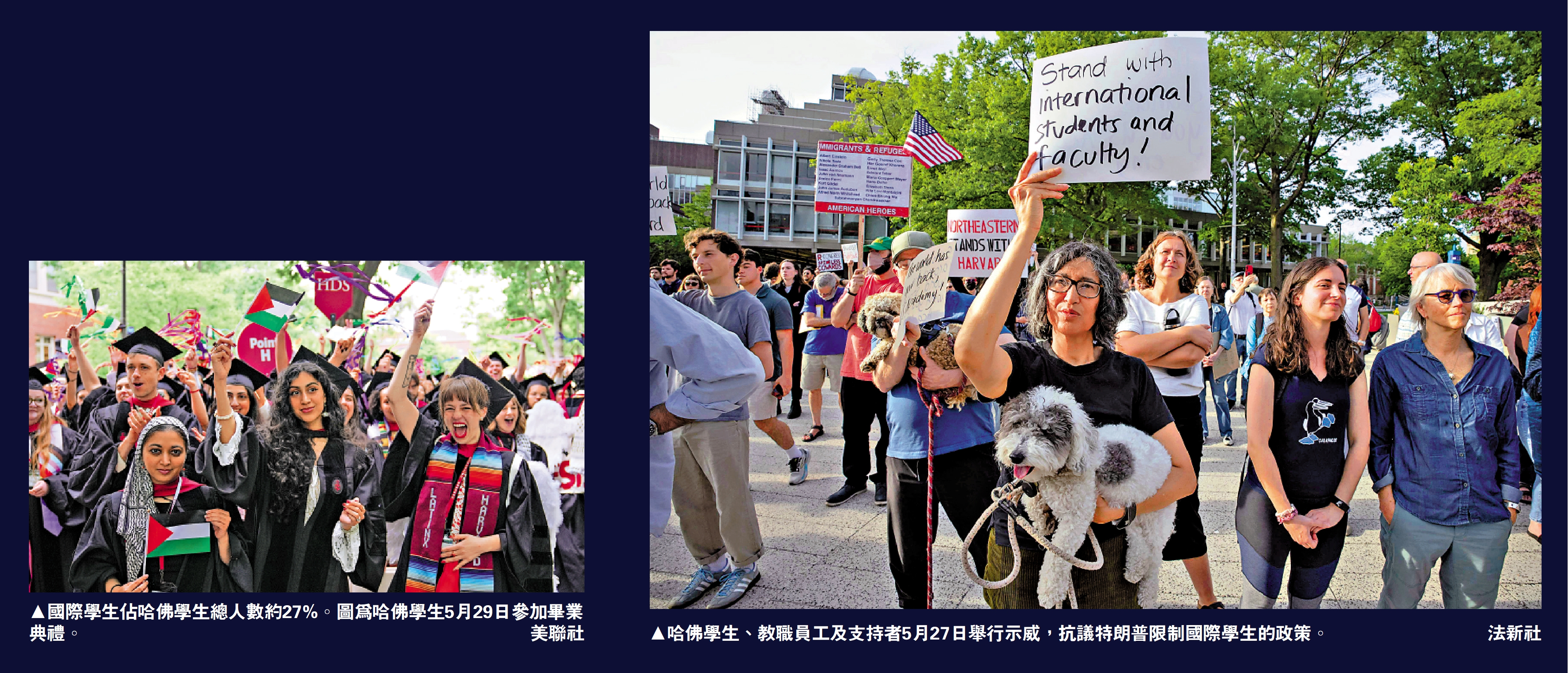 •5月22日,特朗普政府宣布取消哈佛招收國際學生的資質,並要求現有國際學生轉學。6月4日,特朗普簽署公告,以「維護國家安全」為藉口限制哈佛國際學生簽證,暫停持有F、M或J簽證就讀哈佛大學課程的外國人以非移民身份入境,並考慮撤銷部分在校生的簽證。