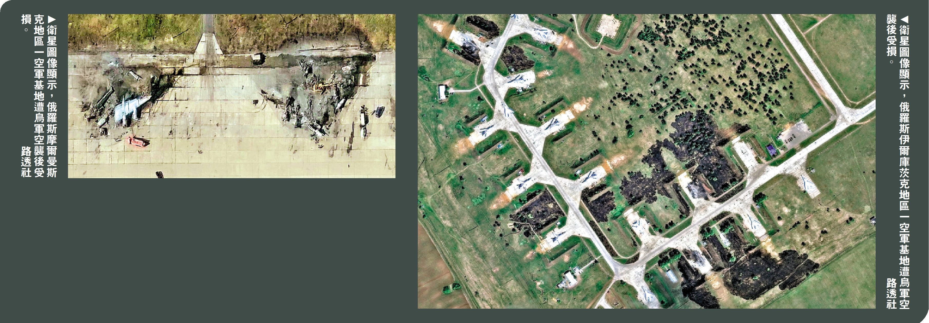 •烏克蘭1日發動「蛛網」行動,出動117架無人機襲擊俄境內多個軍用機場,41架俄軍機被摧毀或受損。路透社4日引述美國官員稱,美方評估烏克蘭無人機在此次襲擊中擊中了20架俄戰機,摧毀了其中約10架。