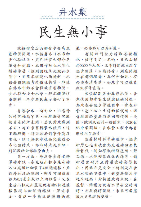 香港食水一向安全,出意外的情況極為罕見,出現瀝青沉澱物更是聞所未聞。居民對此感到不安,連日來買樽裝水飲用,這不難理解。特區政府對事件高度重視,除了抽取水樣品化驗並公布化驗結果,亦即時清洗水缸,將沉澱物全部排除出去。