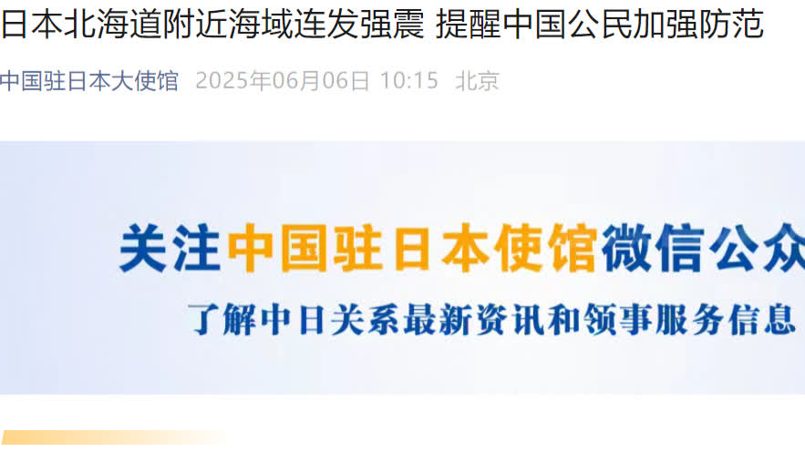 據「中國駐日本大使館」公眾號6月6日消息,駐日大使館發布安全提醒。近日,日本北海道太平洋一側地震頻發。據日本媒體報道,5月下旬以來,該地區共發生5級以上地震4起。其中,5月31日北海道釧路發生6級地震,6月2日凌晨北海道十勝海域發生6.3級地震。日本氣象廳稱千島海溝周邊隨時可能發生大規模地震,呼籲民眾加強日常防範。