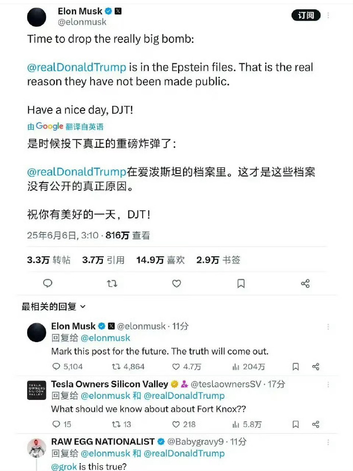 「是時候投下重磅炸彈了:特朗普在愛潑斯坦的檔案裏」,馬斯克在其社交媒體平台X上發布消息並轉發一條早年間特朗普與愛潑斯坦聚會的視頻。