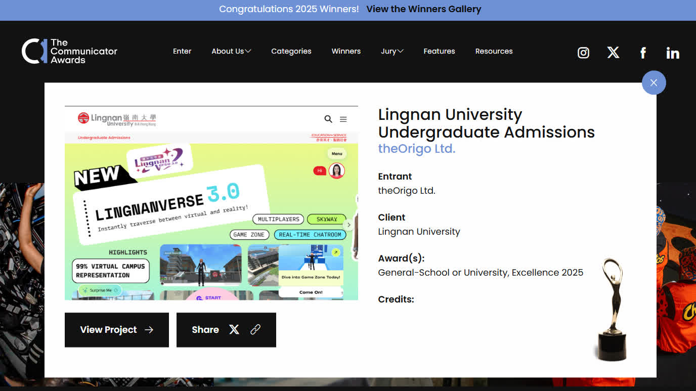 Lingnan University’s Registry is delighted to announce that its new Undergraduate Admissions website has received the Award of Excellence (Gold) at the 31st Annual Communicator Awards 2025. This international recognition, evaluated by the Academy of Interactive & Visual Arts (AIVA), places Lingnan alongside globally renowned brands such as Netflix, NASA, Apple, and The Walt Disney Company, all of which were honoured this year.