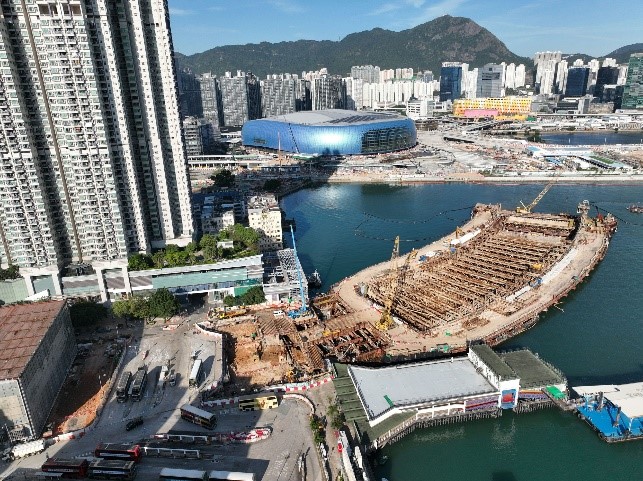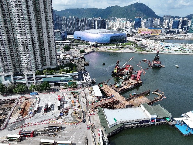 另一邊廂,為建造中九龍幹線工程的海底隧道,相信大家亦留意到九龍灣海上有多個臨時工作台、圍堰及躉船。隧道需穿越維港,為減少工程對這天然海港的影響,施工期間我們只是臨時填海,完成開挖及建造隧道後便會回復海床。此外,考慮到隧道上方的附近海岸有許多公用設施,例如雨水排放口和煤氣公司運輸碼頭,海底隧道的建造工程分為兩階段進行,以維持排水口和運輸碼頭在整個施工過程正常運作。兩個階段的海底隧道建造工程均已順利完成,海床即將回復原狀。
