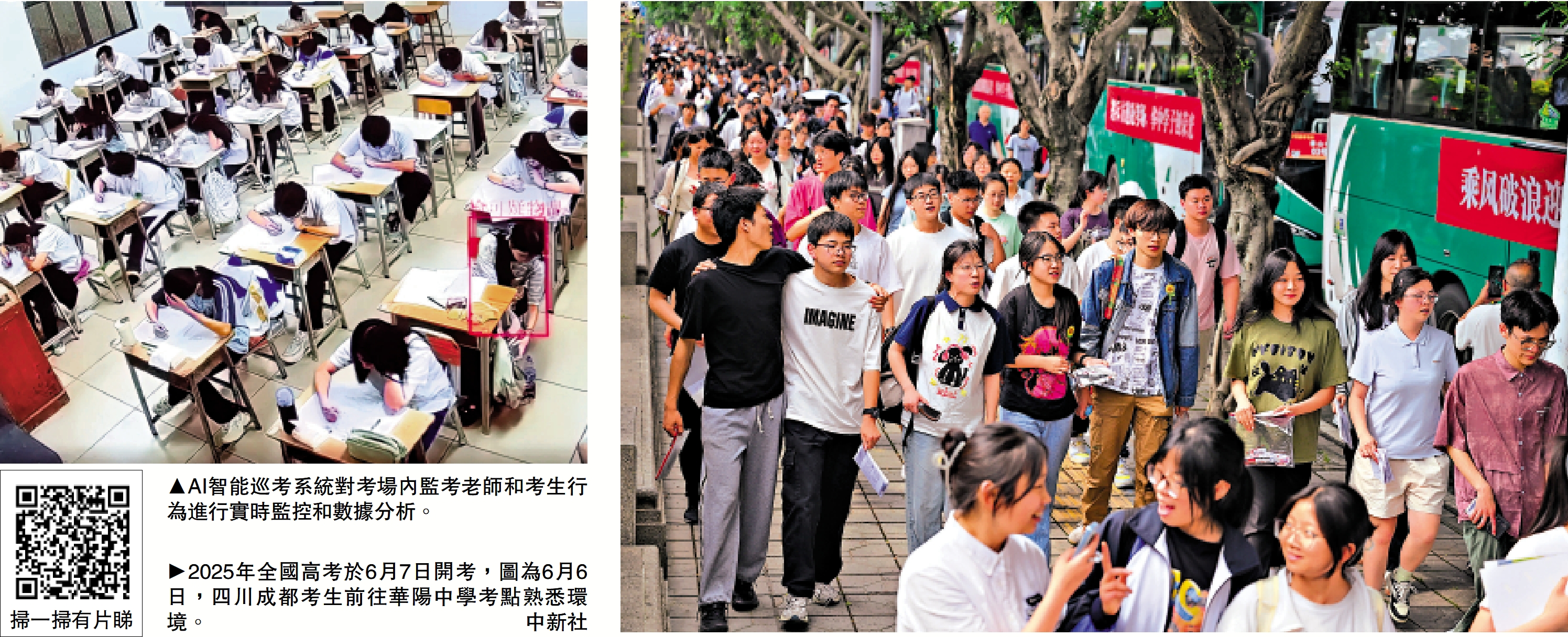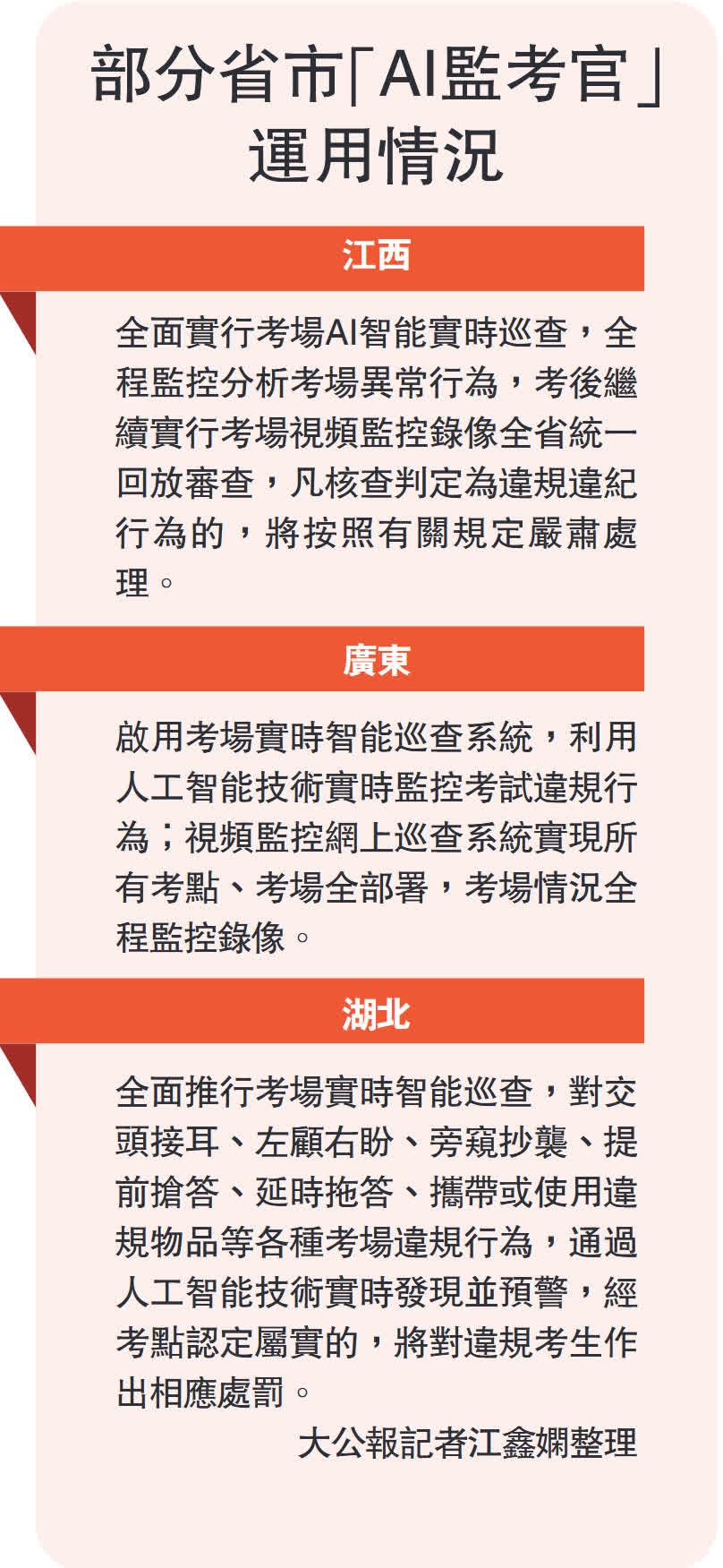 (大公報記者 江鑫嫻)2025年全國高考7日開鑼,1335萬考生迎來人生大考。今年,教育部明確各地要積極推動高考智能巡查巡檢。江西、湖北、廣東等多地宣布,全面推行考場AI智能巡查,以視覺分析監控考場異常行為,凡核查判定為違規違紀行為的,將按照有關規定嚴肅處理。這項技術是對傳統的人工監考和視頻監考的有機補充。