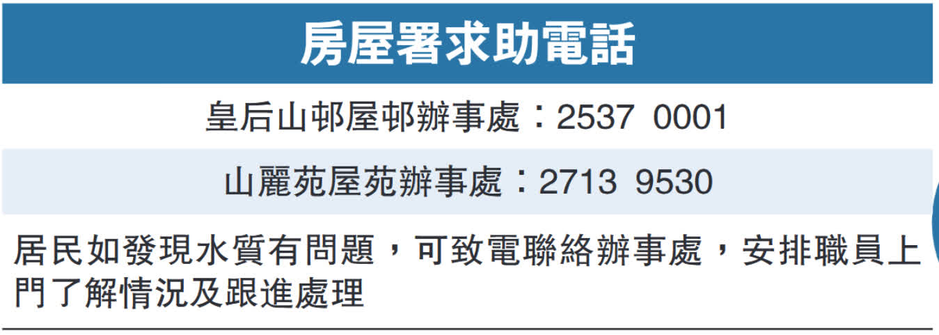 (大公報記者 王亞毛)水務署昨日在網上公布,過去一周(5月30日至6月5日)在皇后山邨和山麗苑共13座大廈抽取食水樣本的快速毒性測試結果,顯示全部樣本無毒及無致癌物質,外觀清澈。大公報記者昨日於皇后山邨現場直擊,不少居民肯定政府的補救措施,但因仍有沉積物存在,故選擇較多依靠過濾器、臨時水箱,或自購樽裝水飲用。
