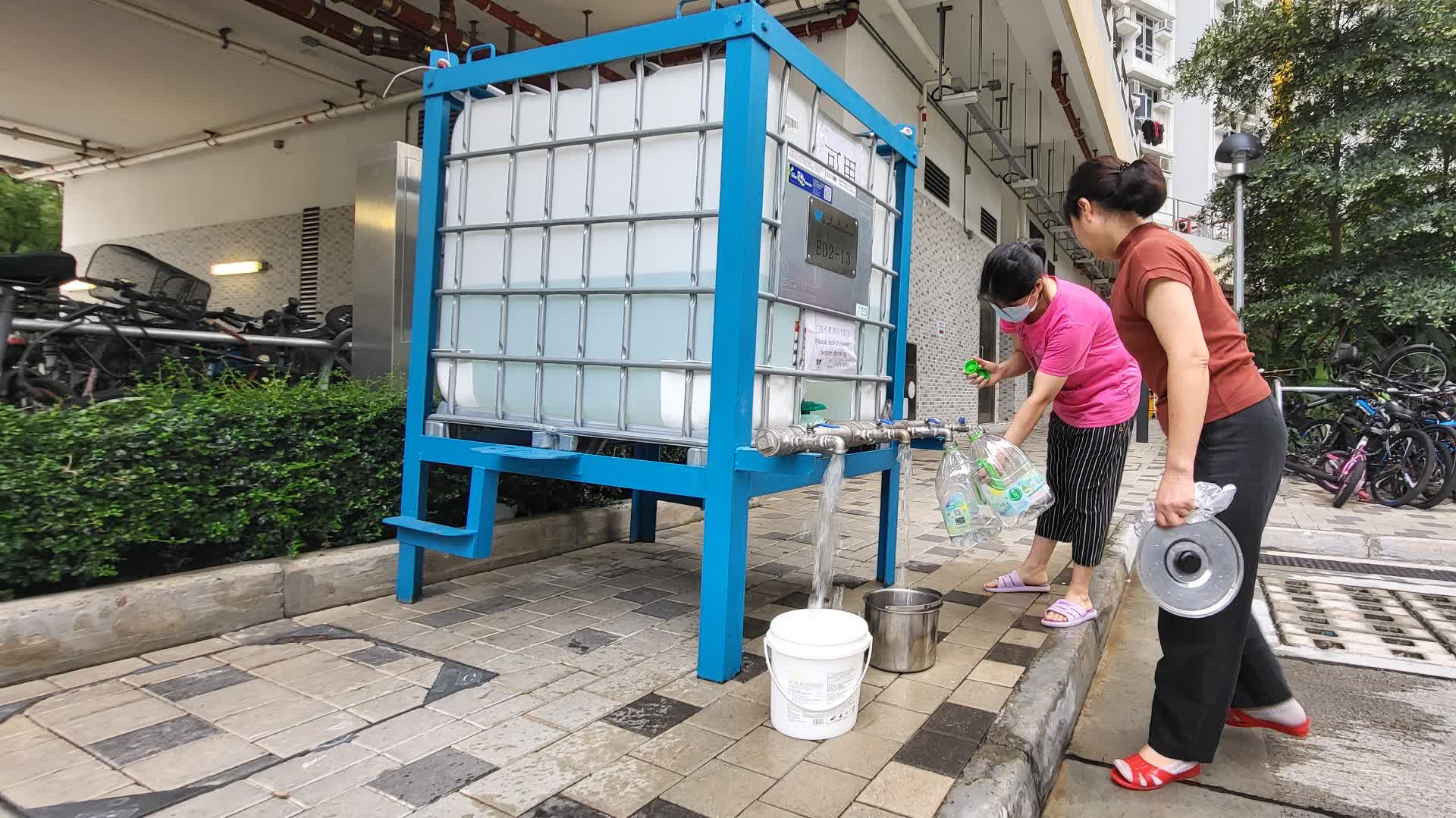 日前,政府在皇后山邨安排放置水箱,作臨時供水之用,記者昨日在水箱附近觀察,有市民到來取用食水。