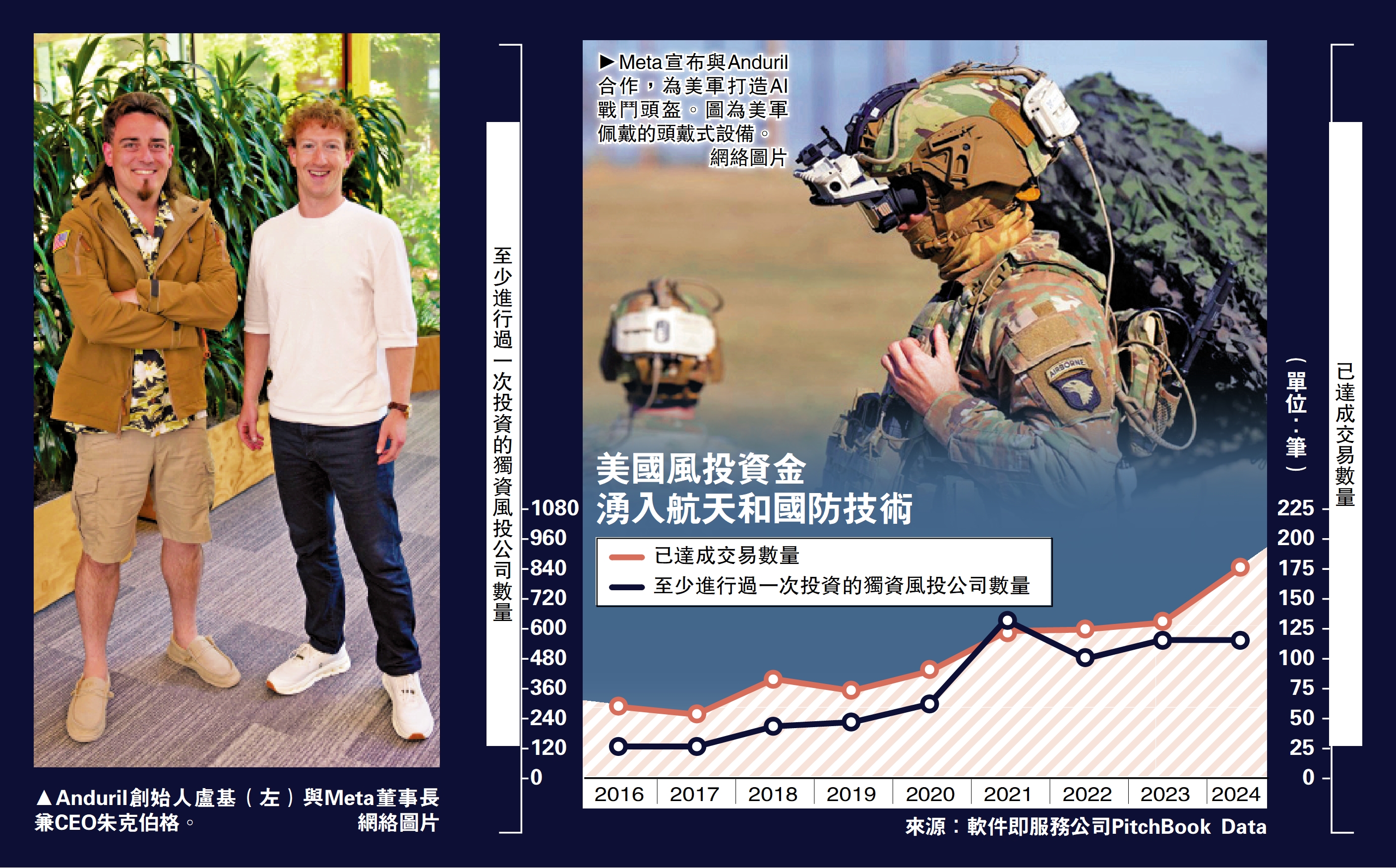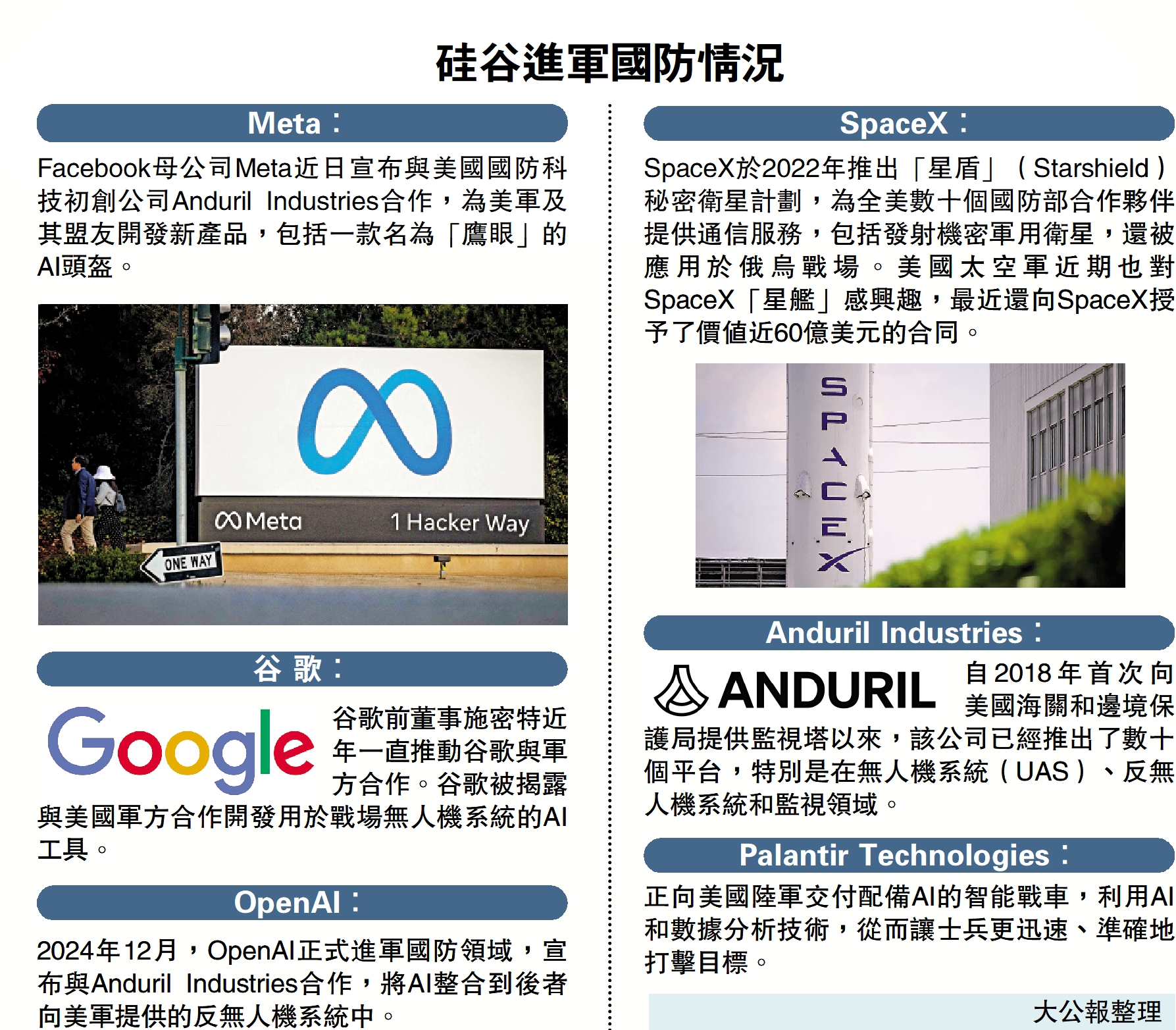 大公報綜合報道,近年,硅谷企業紛紛進軍國防軍事業務,而科技巨頭Meta近日宣布計劃為美軍打造人工智能(AI)戰鬥頭盔更是引發關注。Meta首席技術官博斯沃思近日公開表示,硅谷對參與美國國防項目的態度已發生轉變,直言硅谷潛藏着遠超外界想像的「愛國主義根基」,科技行業現在更自信且自如地公開支持與軍方合作的項目。