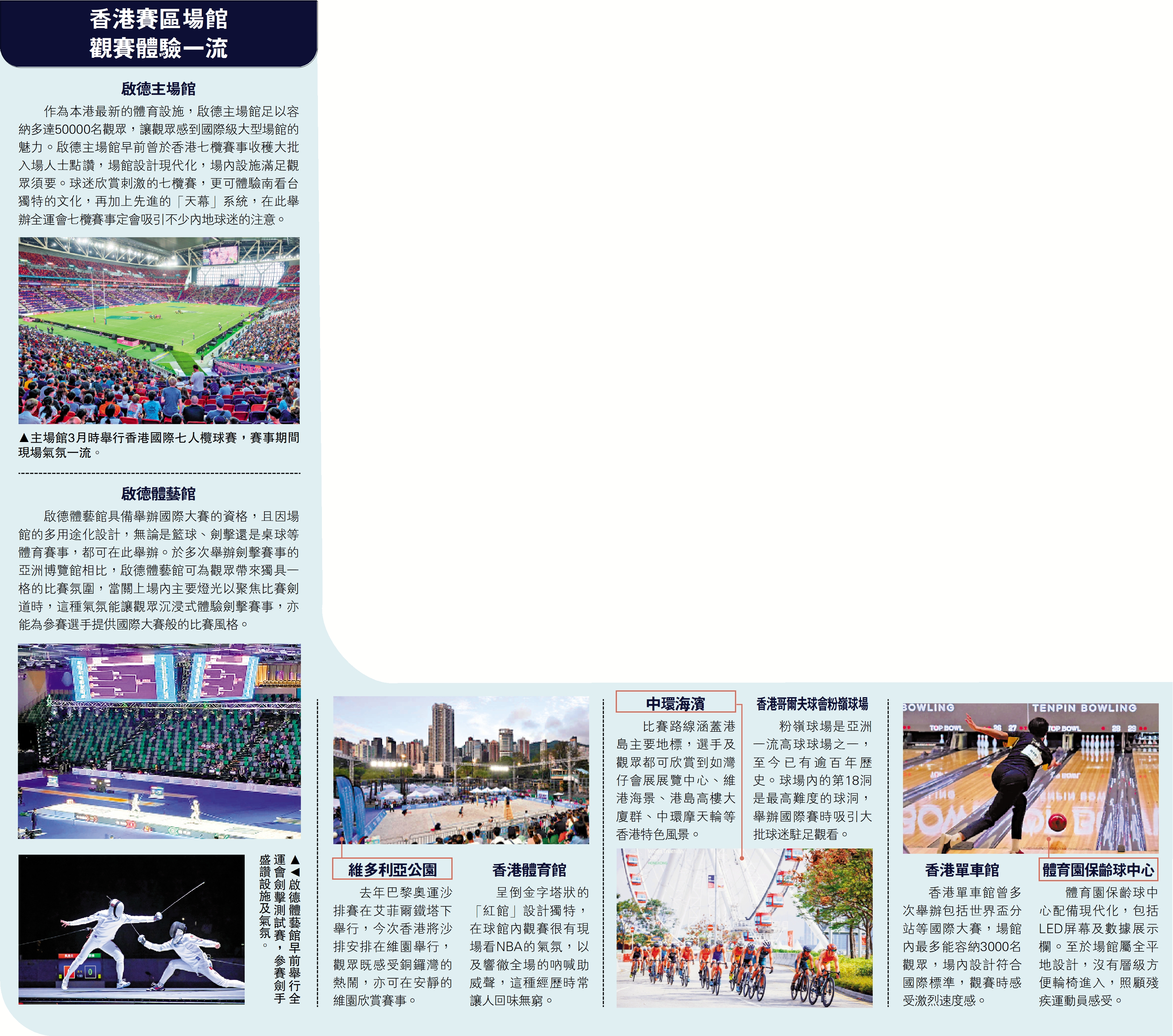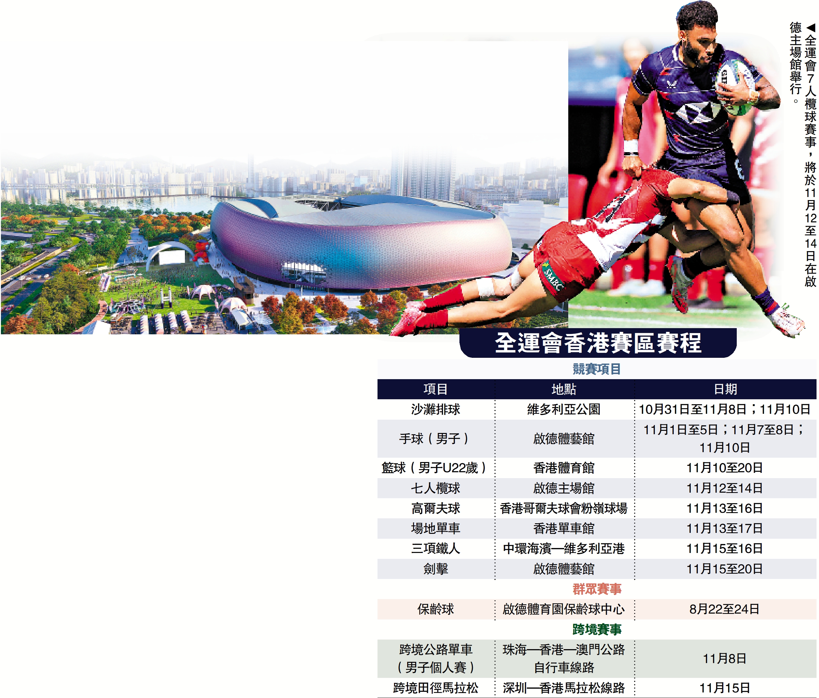 (大公報 記者 朱家立)由粵港澳三地合辦的第十五屆全運會將於今年11月9日開幕,當中香港將承辦的8個項目及一個群眾項目,全運會香港賽區亦於昨日公布賽程表,於維多利亞園舉行的沙灘排球項目將會率先在10月31日展開,焦點場館的啟德主場館,將於11月12至14日舉行七人欖球賽事。至於由珠海、香港及澳門合辦的公路單車男子個人賽就會於11月8日舉行,而途經深圳和香港的跨境田徑馬拉松賽事於11月15日進行。群眾賽事保齡球項目則在8月22日上演。