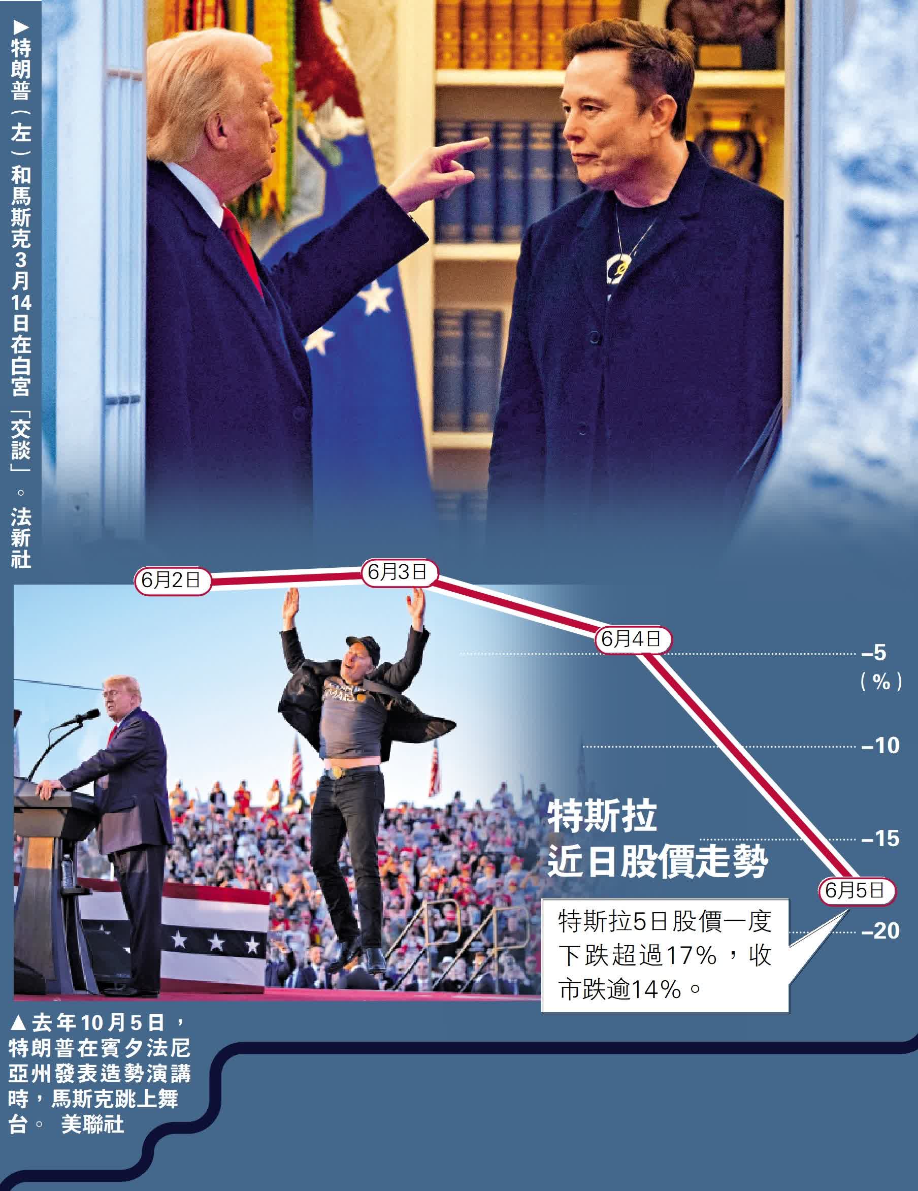 大公報A20版國際《特朗普馬斯克決裂 Tesla市值蒸發逾萬億》綜合報道,美國總統特朗普和億萬富翁、特斯拉(Tesla)創辦人馬斯克5日在網上爆發罵戰,兩人互爆黑料,並進行人身攻擊。最新消息稱,特朗普沒有與馬斯克交談的計劃,兩人的關係似乎難以修復。點擊閱讀詳情>>