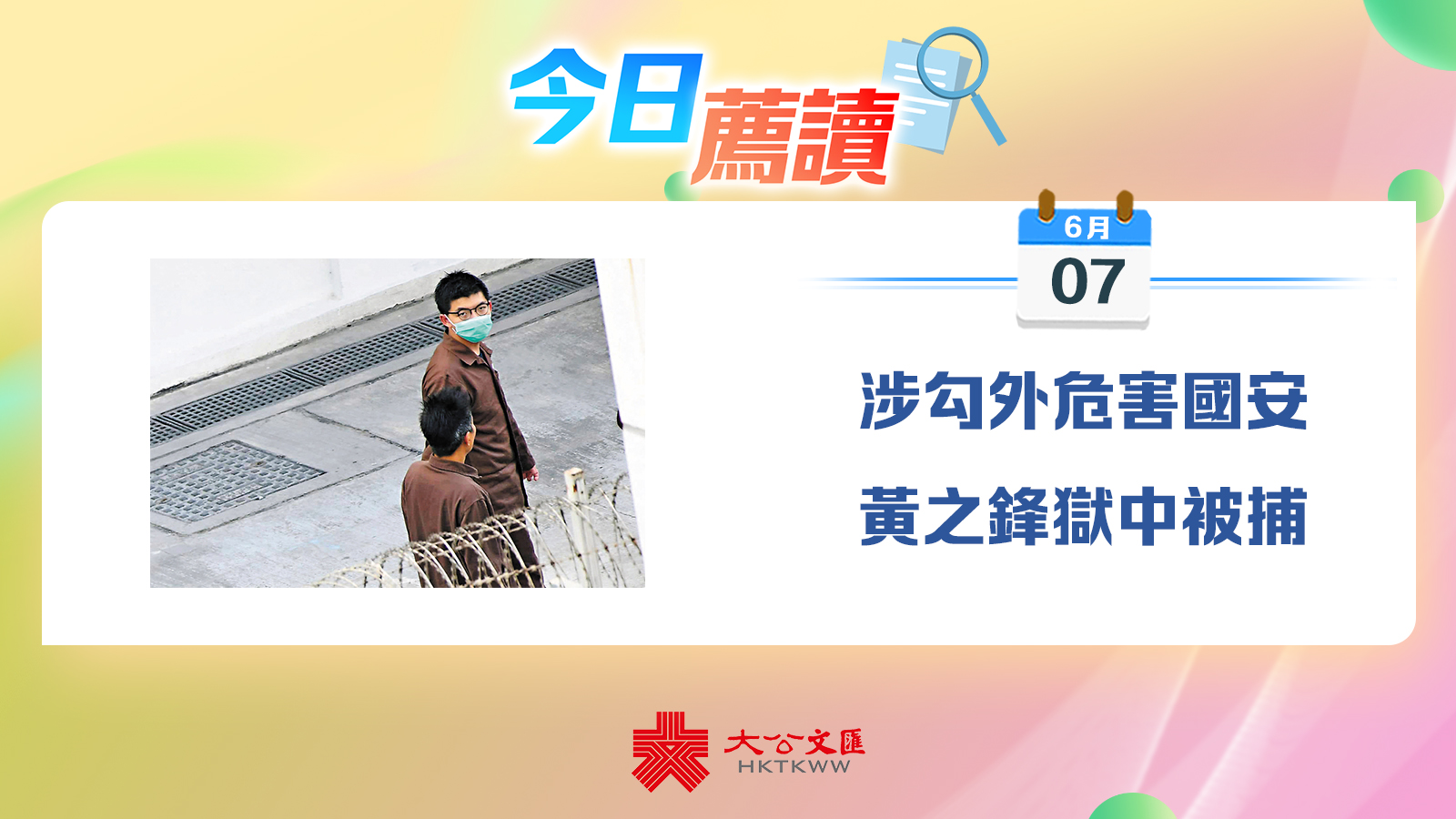 香港文匯報A11版港聞《涉勾外危害國安 黃之鋒獄中被捕》報道,在「35+串謀顛覆政權」案中,被判囚56個月並在赤柱監獄服刑的黃之鋒,昨日被警務處國家安全處拘捕,被落案起訴一項「串謀勾結外國或者境外勢力危害國家安全」罪,案件在西九龍裁判法院提堂。點擊閱讀詳情>>