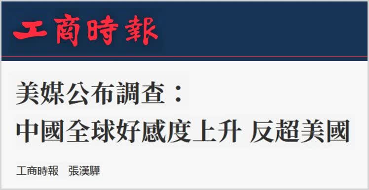 譚主仔細查閱這份民調及相關報道發現,這份民調對來自加拿大、法國、巴西、日本、俄羅斯、英國等41個國家和地區的4900名成年人進行了調查,中美受訪者的看法未納入分析。調查結果顯示,自今年1月以來,這41個國家中,有34個對中國的評價提升,而有38個對美國的評價下降。
