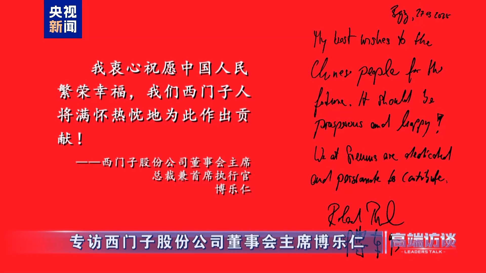 鄒韻:有件事很有意思,很多人可能不了解。您剛才提到,西門子在中國開展業務已經150多年了,這段淵源始於19世紀70年代。這是西門子的創始人寫給他弟弟的信件,記錄了他當時的想法。如今,一百多年過去了,全球格局發生了深刻變化,您認為中國市場在貴公司的全球布局中扮演了什麼樣的角色?