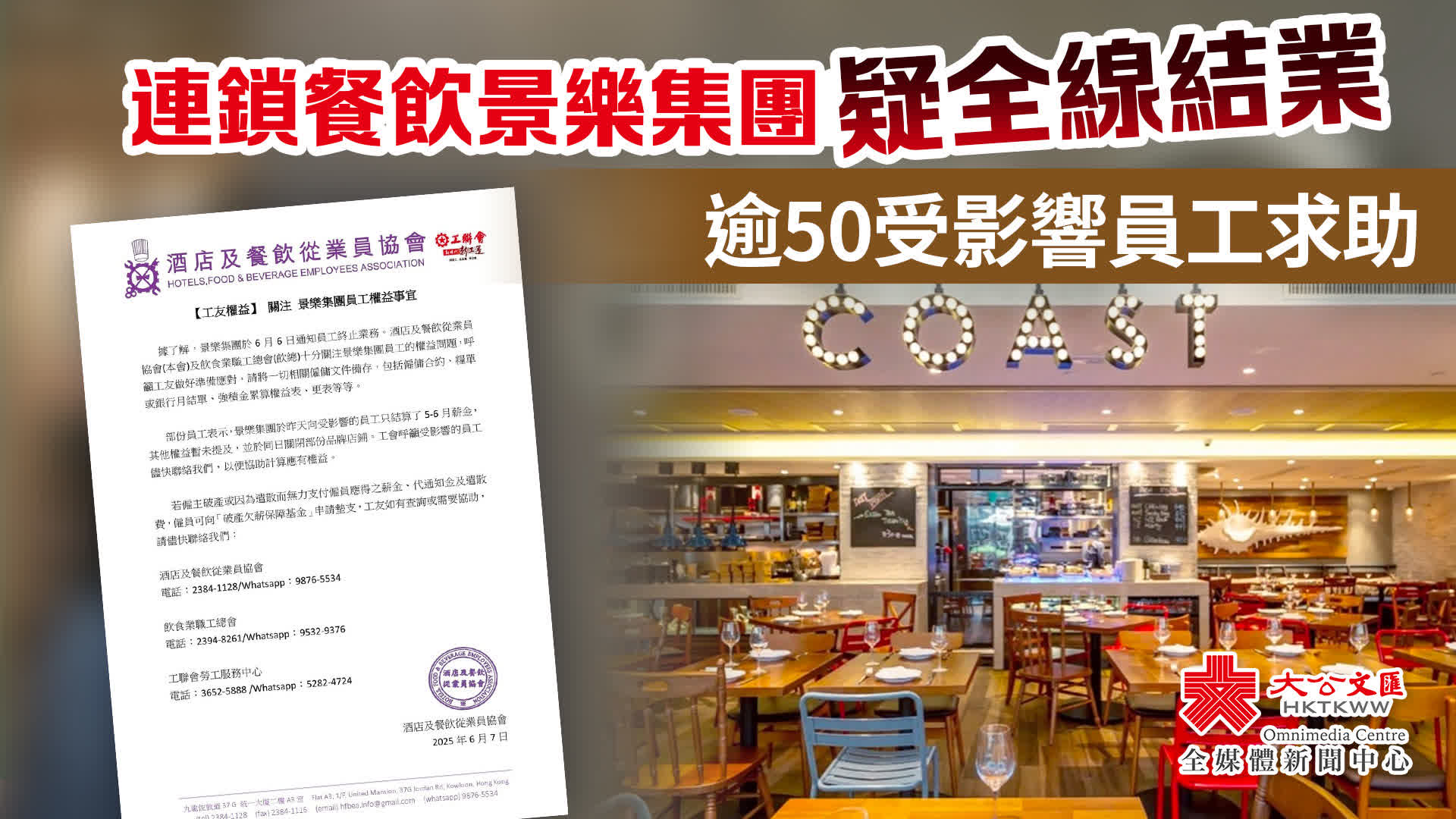 大公文匯全媒體報道,再有餐廳集團結業,飲食業職工總會權益總幹事招冠聰表示,景樂集團於6月6日通知員工終止業務,旗下3間餐廳相繼結業,收到包括餐廳家傳滬曉、海玉蘭以及唐的員工求助,受影響人數已達50至60人。