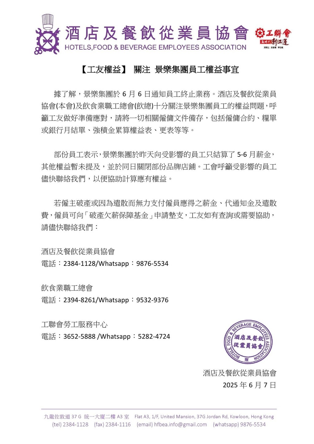 酒店及餐飲從業員協會引述部分員工表示,景樂集團昨日向受影響員工結算了5至6月薪金,其他權益暫未提及,並於同日關閉部分品牌店舖。有員工表示並無收到代通知金或遣散費,部分人又指公司停供強積金。