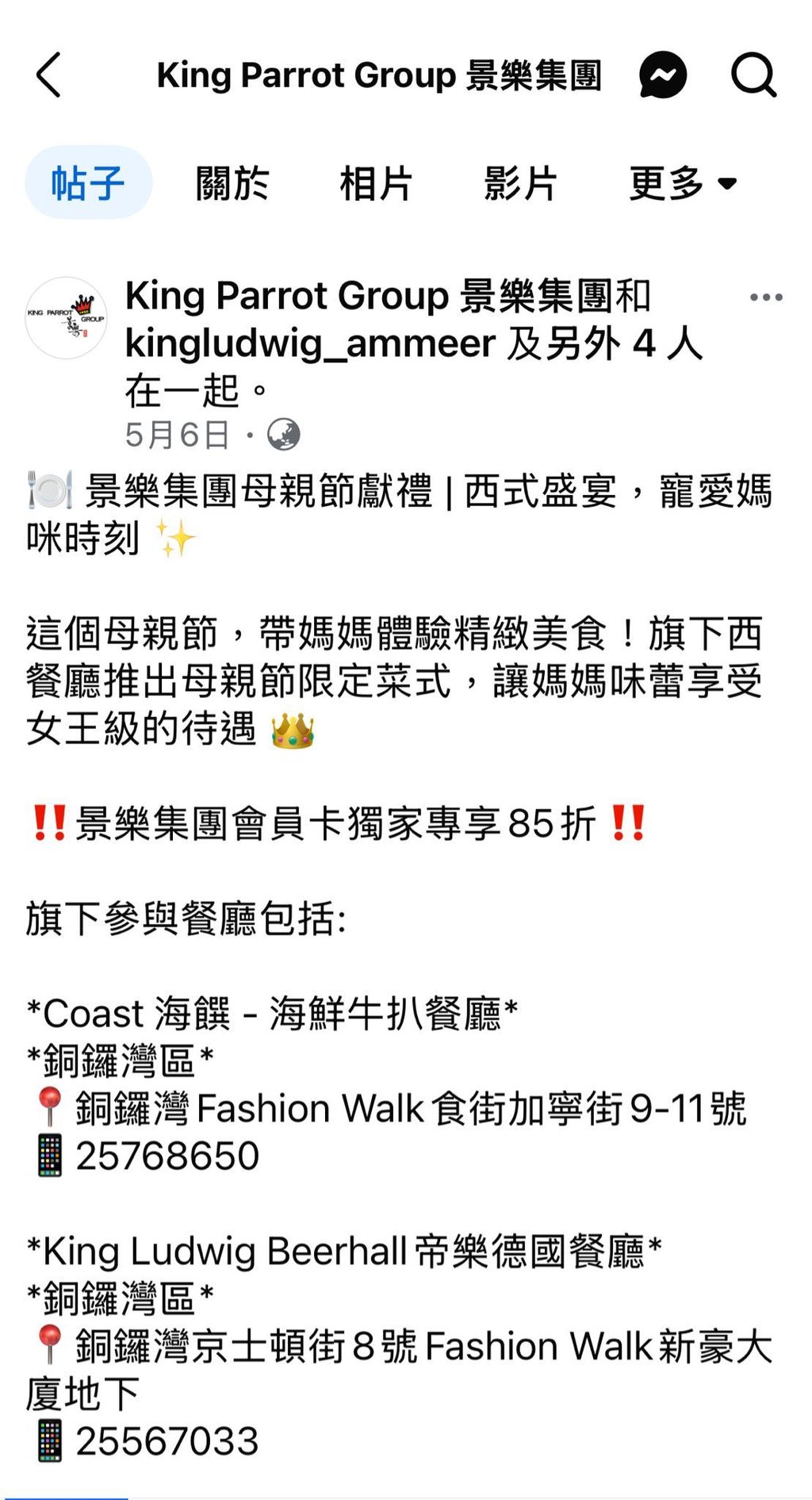 景樂集團網站現已下架,查看集團社交網站,上月6日發出最新帖文,宣傳推出母親節限定菜式。帖文標出當時有8間餐廳,包括Coast海饌-海鮮牛扒餐廳、King Ludwig Beerhall帝樂德國餐廳、Dirty Skillet、King Ludwig am Meer、唐、家傳滬曉、海玉蘭及子鴨留香。