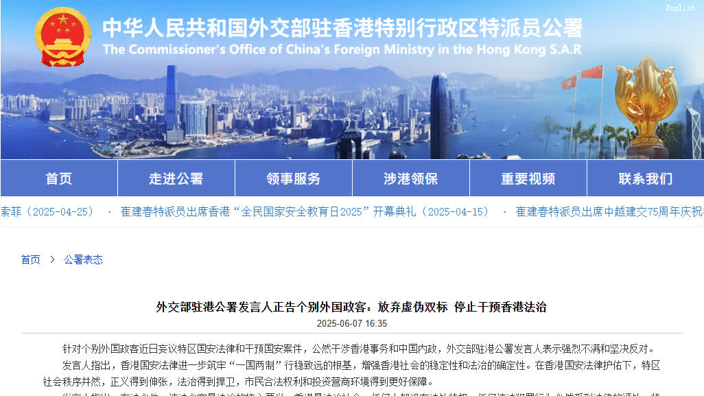 發言人強調,個別外國政客罔顧本國有多部國安法律的事實,罔顧自身在人權法治方面的斑斑劣跡,罔顧不干涉內政的國際關係基本準則,公然妄圖干預特區法治,虛偽雙標原形畢露。我們敦促有關政客認清事實、改弦更張,立即停止以任何形式插手香港事務和干涉中國內政。