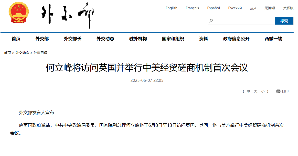 大公文匯網報道,外交部網站今日(7日)消息,外交部發言人宣布,應英國政府邀請,中共中央政治局委員、國務院副總理何立峰將於6月8日至13日訪問英國。其間,將與美方舉行中美經貿磋商機制首次會議。