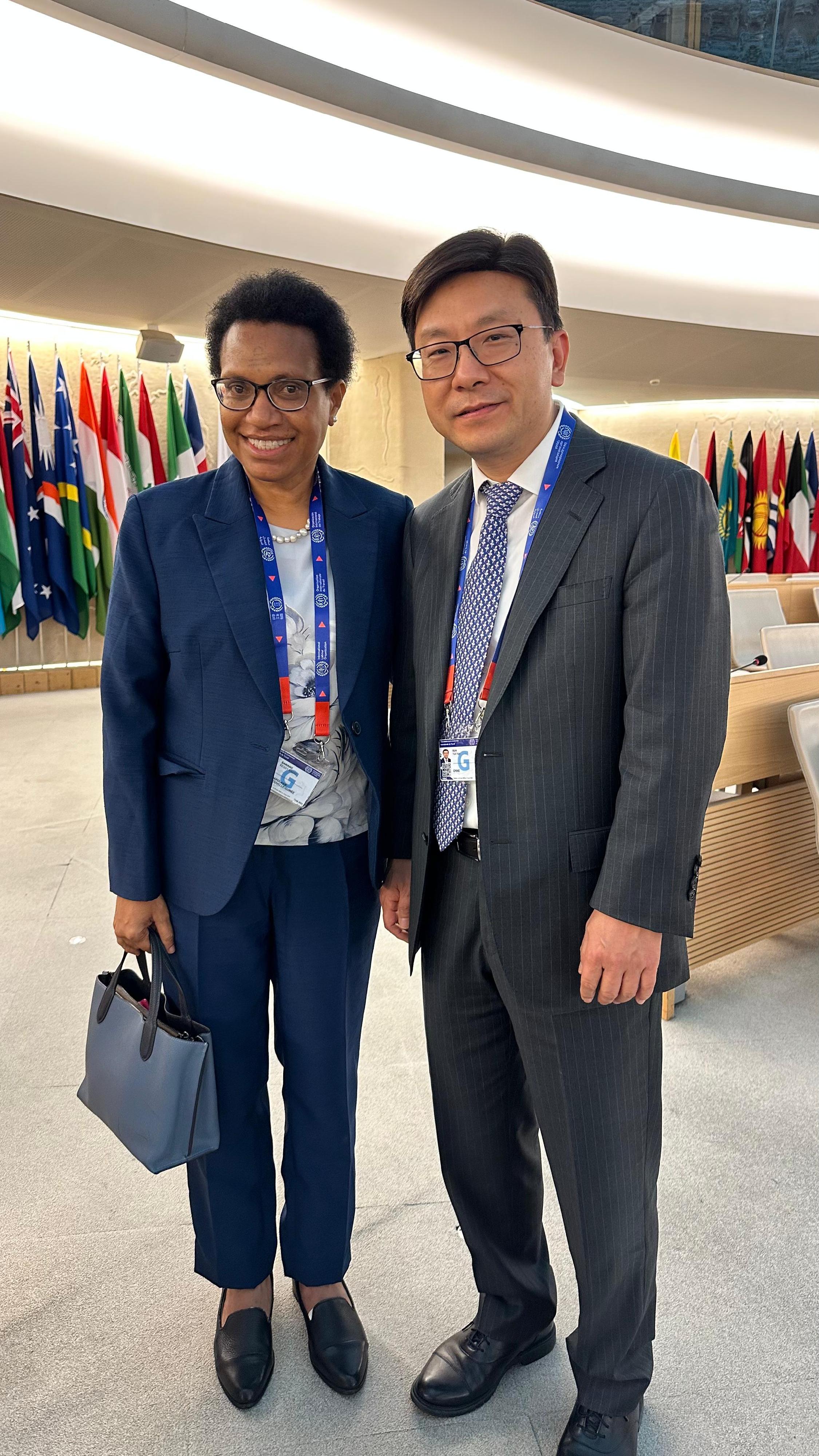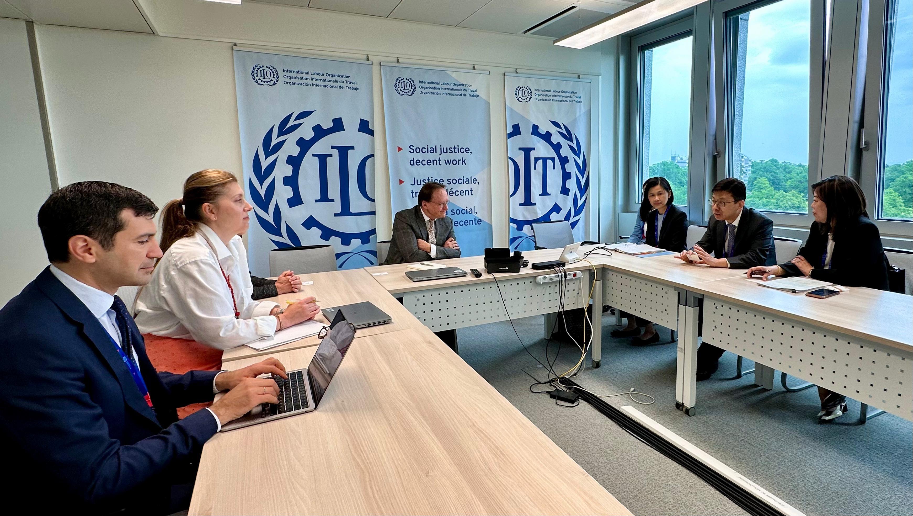在日內瓦期間,孫玉菡除列席大會各委員會外,亦與國際勞工組織高層官員及一同出席大會的國際組織代表舉行雙邊會議,就實施國際勞工標準、社會保障、職業安全與健康、勞資關係、平台經濟等課題交流,闡析香港的現況,適時對國際勞工組織的意見作出回應,並就如何進一步深化合作進行具建設性交流。