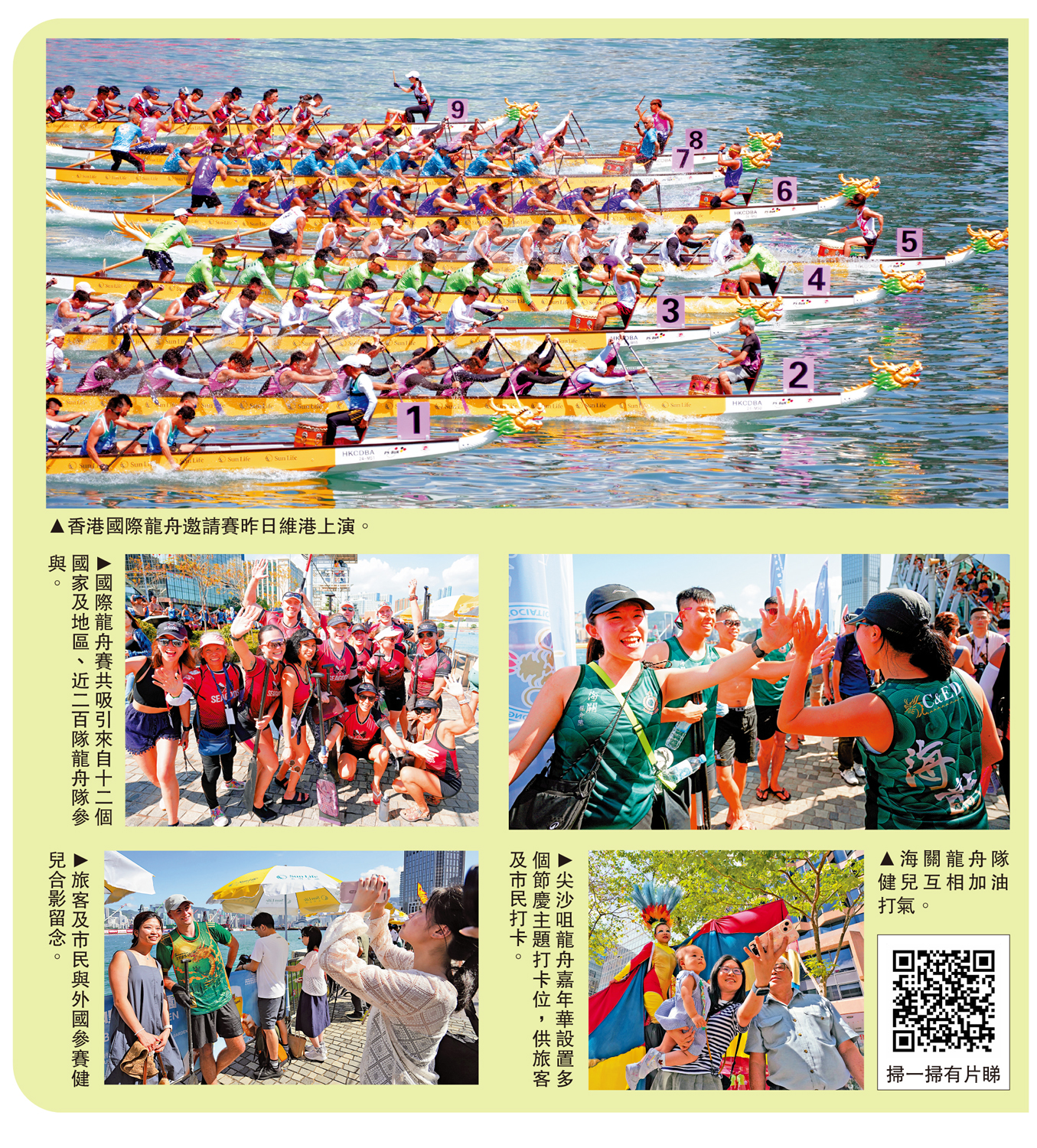 今年的香港國際龍舟邀請賽自昨日起一連兩日在維港舉辦,共設19項賽事,有超過190隊、來自12個國家及地區,包括香港、內地、澳門、台灣、日本、泰國、馬來西亞、菲律賓、阿拉伯聯合酋長國、加拿大,以及首度參賽的埃及和卡塔爾勁旅。首場比賽於昨日早上8時許開始,維港兩岸早已聚滿市民和遊客,鼓聲一響,觀眾與各隊隊員一起歡呼吶喊,為龍舟健兒加油助威。