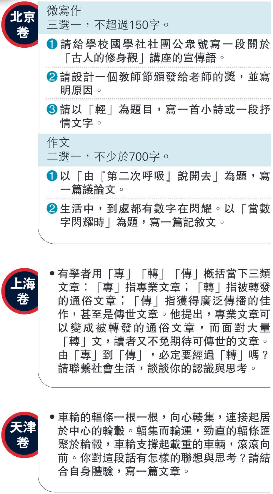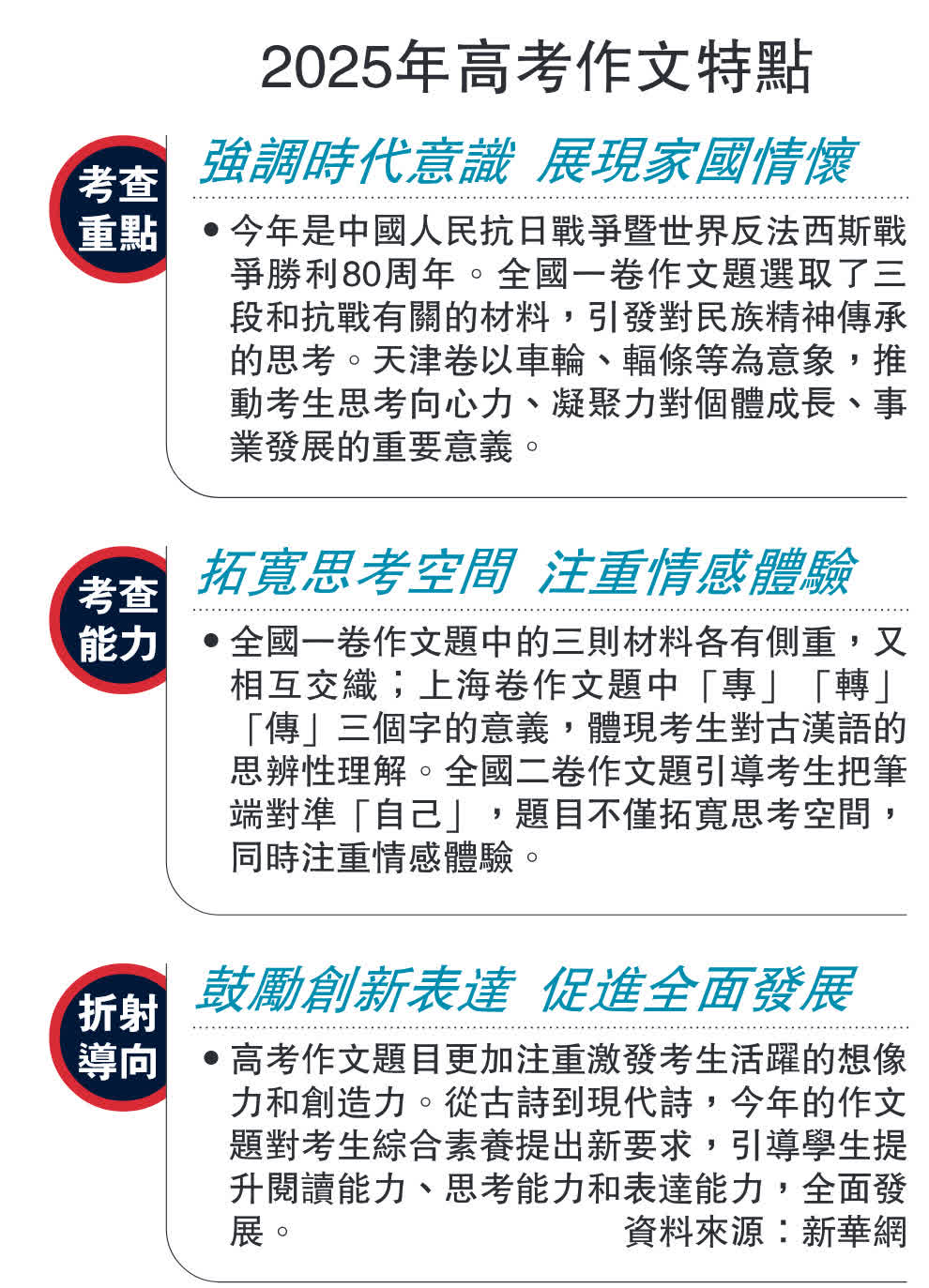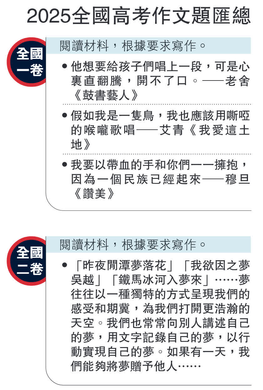 (大公報記者 江鑫嫻 實習記者 鄒孟奇)2025年全國高考7日開考,首場語文考試剛剛結束,作文題目已衝上網絡熱搜榜。今年全國共5套語文高考試卷,從對「民族精神」的追問,到對「夢想實現」的探討;從「第二次呼吸」的哲理思考,到「專─轉─傳」的傳播路徑,一道道作文題目,既考語言之技,也問思想之深。