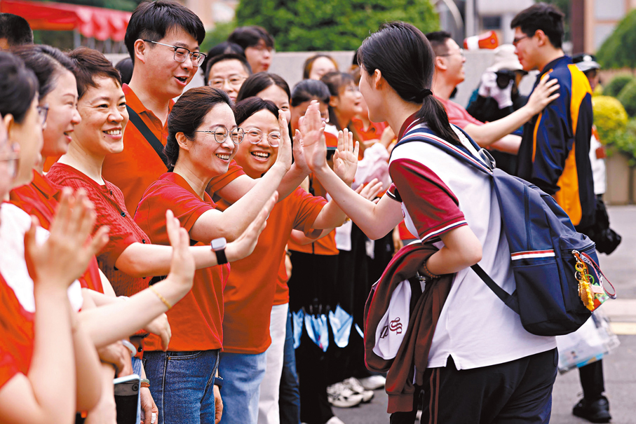 7日上午,香港文匯報記者分別在中國人民大學附屬中學和北京第八十中學望京校區考點門口看到,不少送考家長身穿旗袍或者紅色短袖,手捧寓意「一舉奪魁」「高考加油」的鮮花,在烈日下等候。11點30分,隨着首場語文考試的結束,考生們陸續走出考場,家長們熱情迎接,送上花束,現場儀式感拉滿。