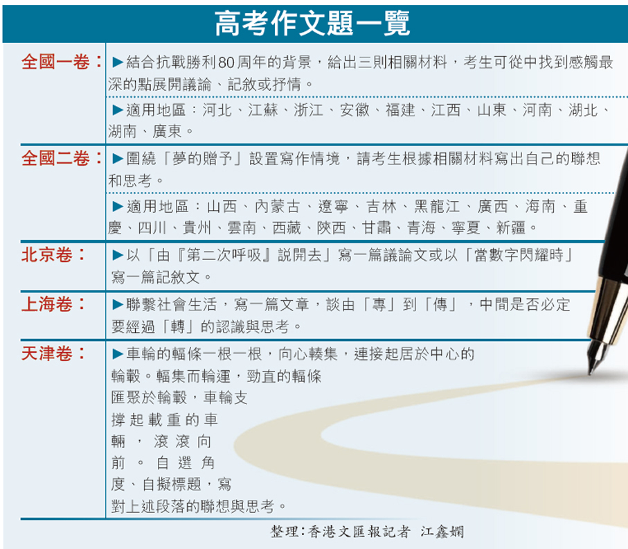 香港文匯報記者統計發現,今年全國共5套語文高考試卷。其中,北京、上海、天津三地語文試卷自主命題,作文題目單獨命制;其他省份高考語文試卷由教育部教育考試院統一命制,包括全國一卷、全國二卷。