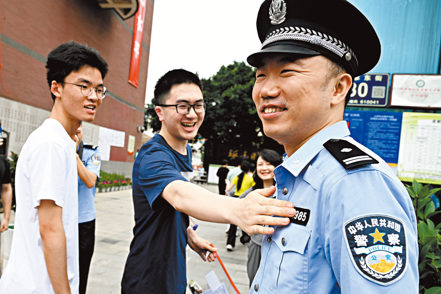 6月7日,2025年全國高考拉開帷幕,1,335萬考生奔赴考場。圖為成都玉林中學考點,警號尾號為「985」的民警前來站崗,考生紛紛打卡,祈願考入「985」重點高校。