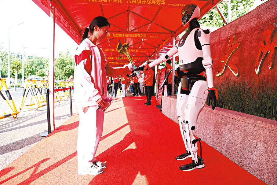 在北京人大附中經開學校考點參加高考的考生,迎來一位特殊的送考員——人形機器人「天工2.0」,它手持鮮花贈予考生,送上硬核祝福。