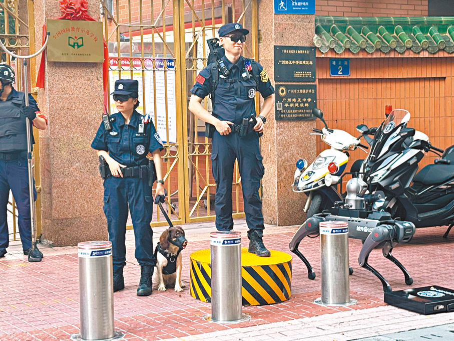 6月7日,全國高考正式開鑼。香港文匯報記者在廣州多個考點踩點感受到,雖然當天氣溫悶熱,但「全民護考」的熱情堪比氣溫更高。清晨7點多,廣州市培正中學門前已封起「考生專用通道」,鐵馬上還貼着「暖心高考」四個字,顯眼又溫馨。記者看到,在這個考點門口,電子巡邏犬與防爆警犬首次「上崗」。一隻穿着黑色背心、戴着口罩的防爆犬「比比」端正地坐在警員旁邊,另一邊則是背着攝像頭、不停息地「噠噠噠」巡邏的四足機器狗,成為考場外一道特別風景。
