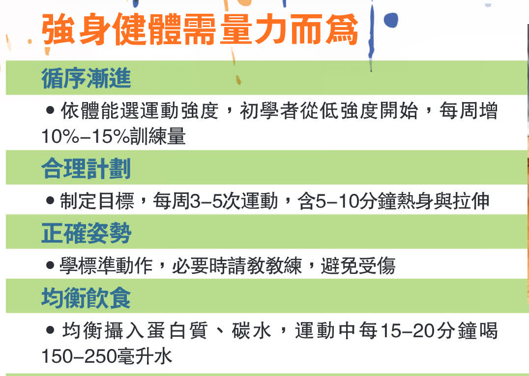 「之前體重是130多斤,現在基本維持在120斤左右,還練出了二頭肌、三頭肌和背闊肌,各項身體指標都優於同齡人,也沒有老年人常有的骨質疏鬆問題。」孫明慧介紹,四年下來,她已形成一套系統的健身習慣:在飲食方面保證一日三餐營養均衡;在訓練方面,每周至少進行5次、按照肩膀、胳膊、胸、背闊、臀腿的順序,一天練一個主要部位,一次鍛煉一個多小時。