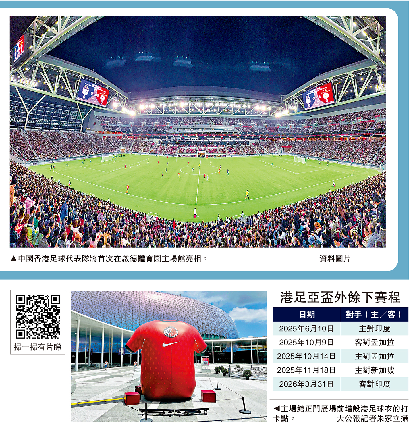 另外,為了增加港足球迷的凝聚力,霍啟山稱足總已在主場館正門廣場前增設港足球衣的打卡點,希望吸引更多球迷到場支持港足。