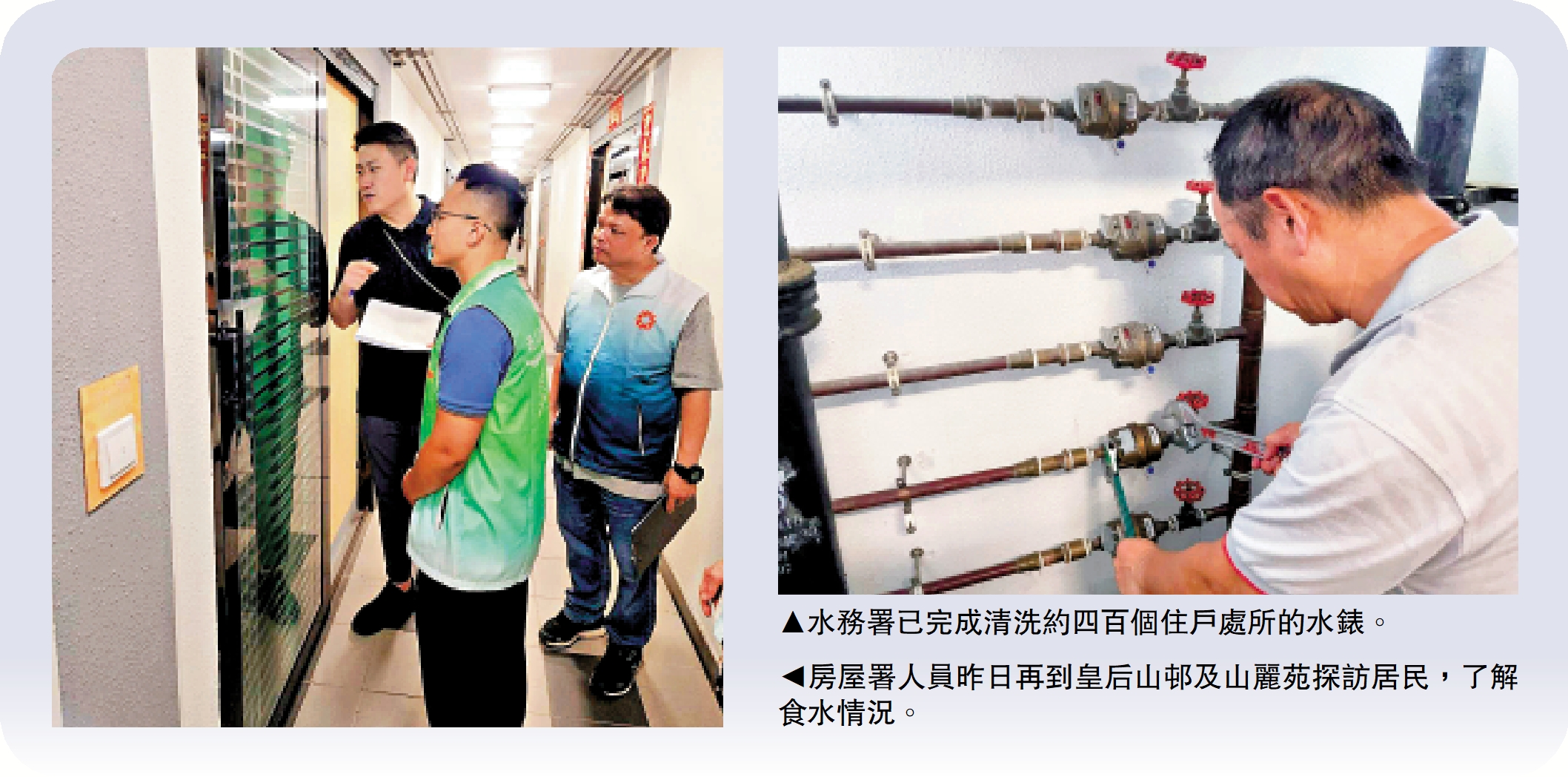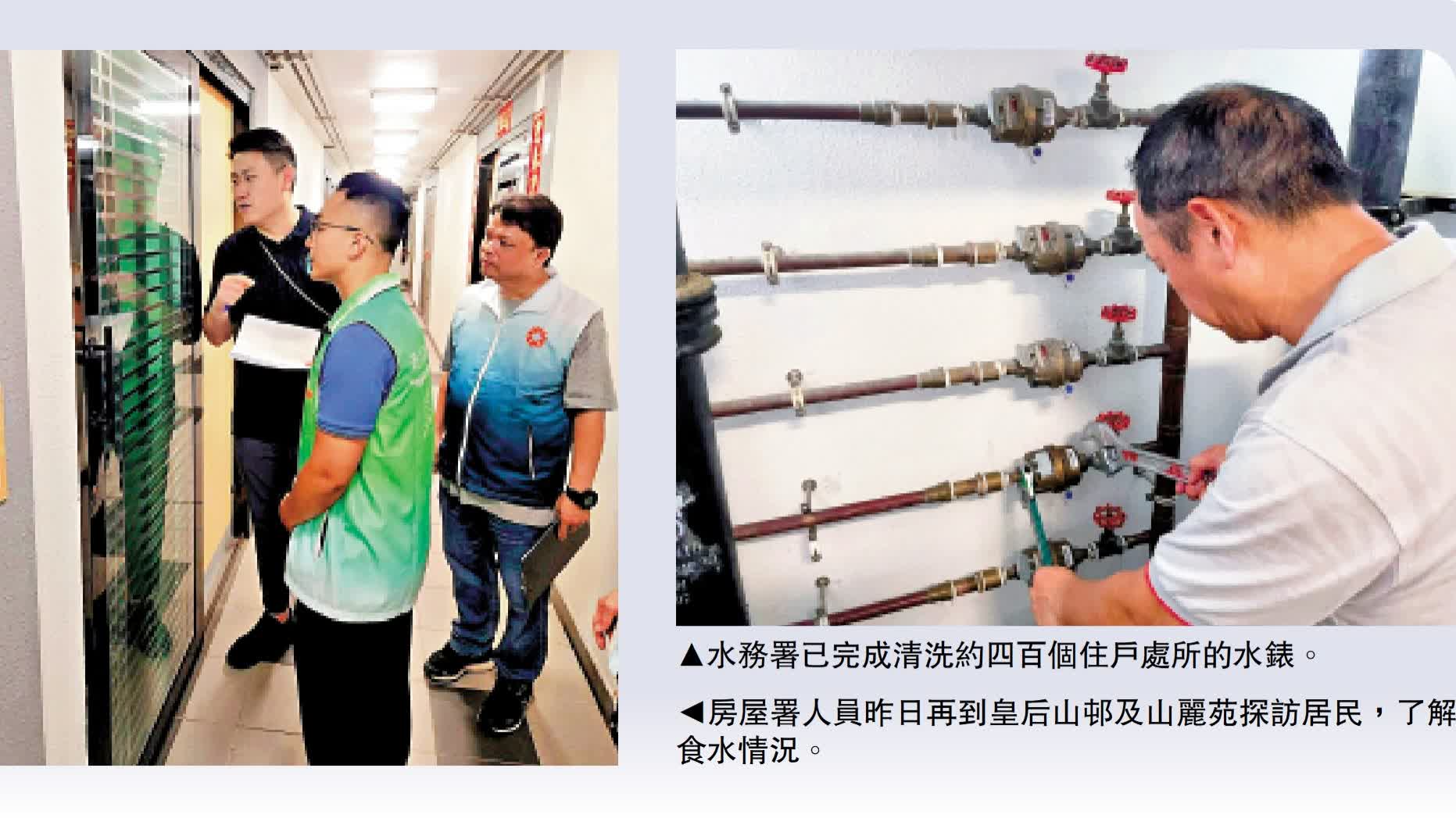 (大公報記者 易曉彤)特區政府高度關注皇后山邨、山麗苑食水事件,行政長官李家超提出10項短中長期應對措施後,相關部門提速落實跟進。水務署增調人手為居民清洗水錶,昨日已完成清洗約400個住戶的水錶,預計1至2日內為餘下約550個住戶完成清洗。房屋署將於今明兩日再一次全面清洗皇后山邨及山麗苑13幢樓宇的食水缸。
