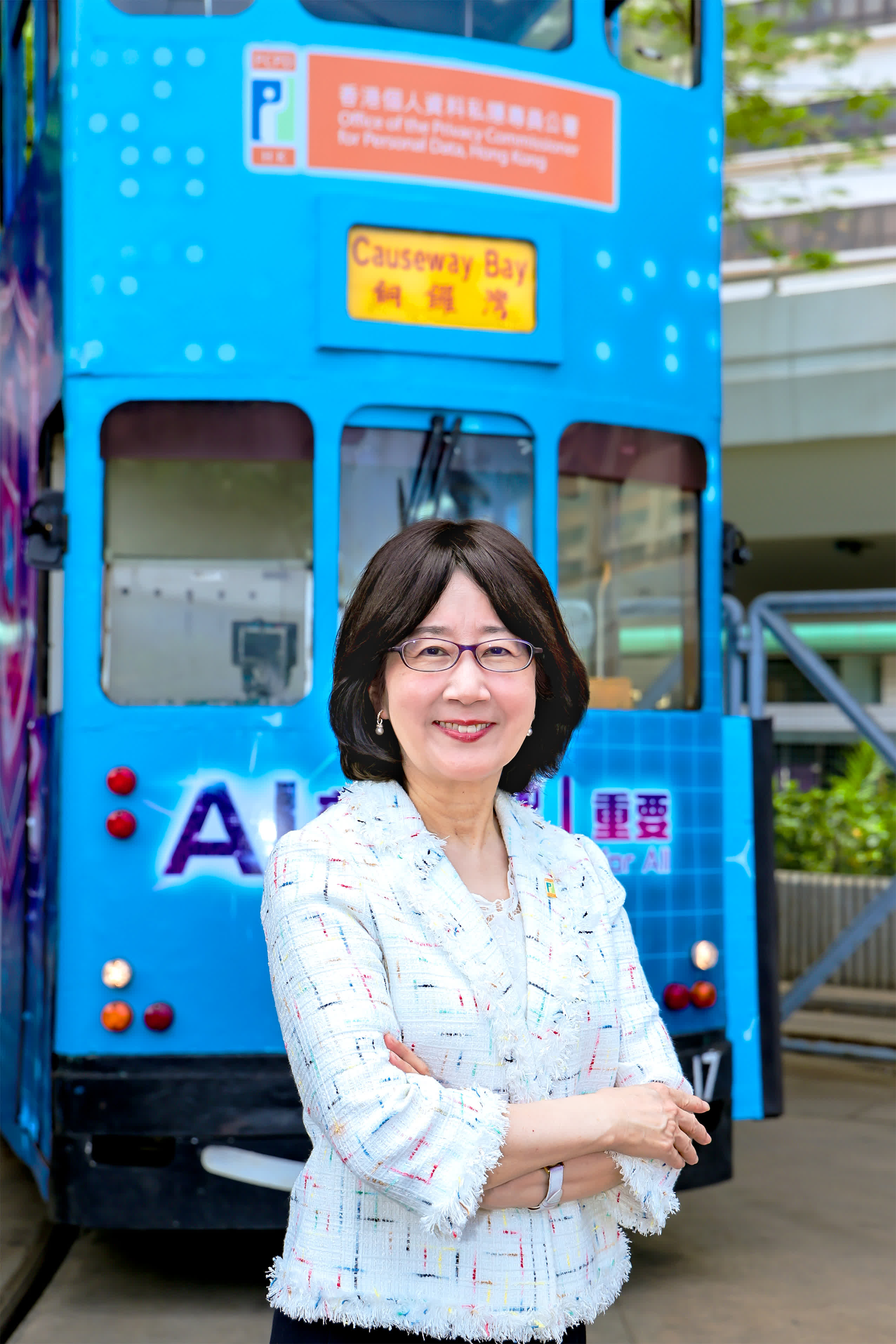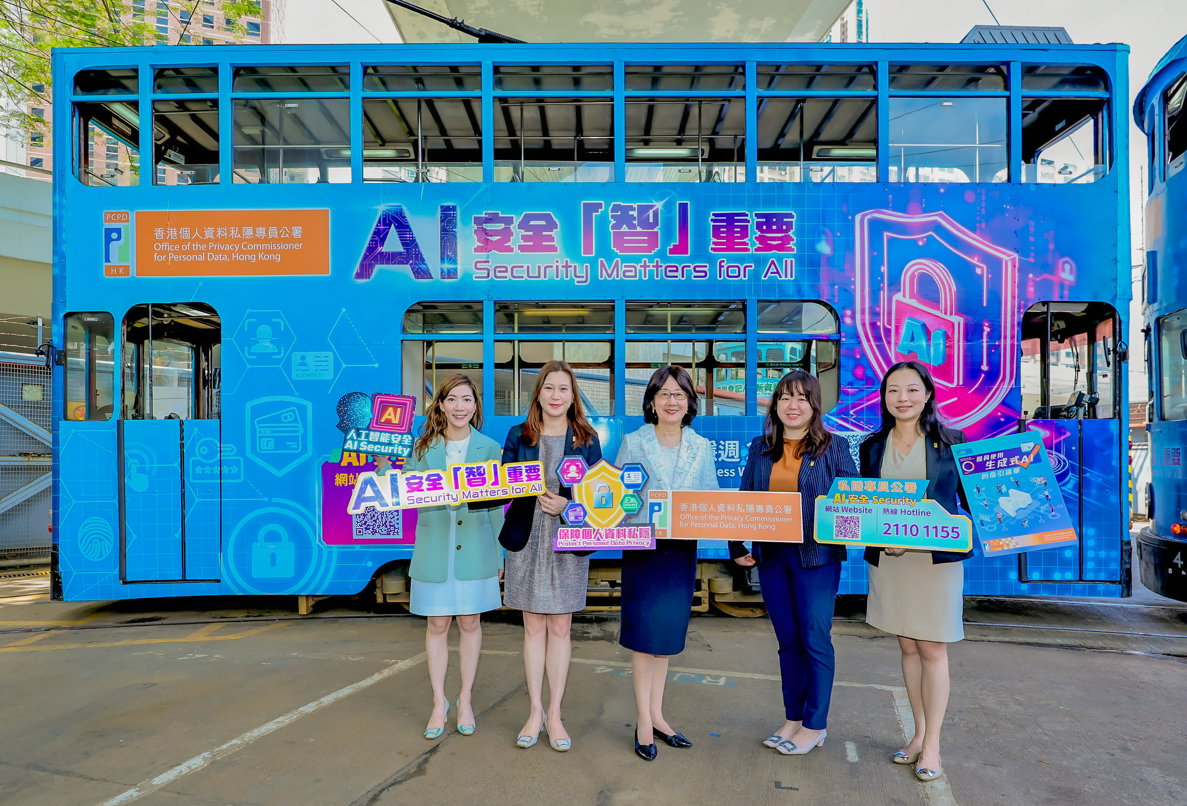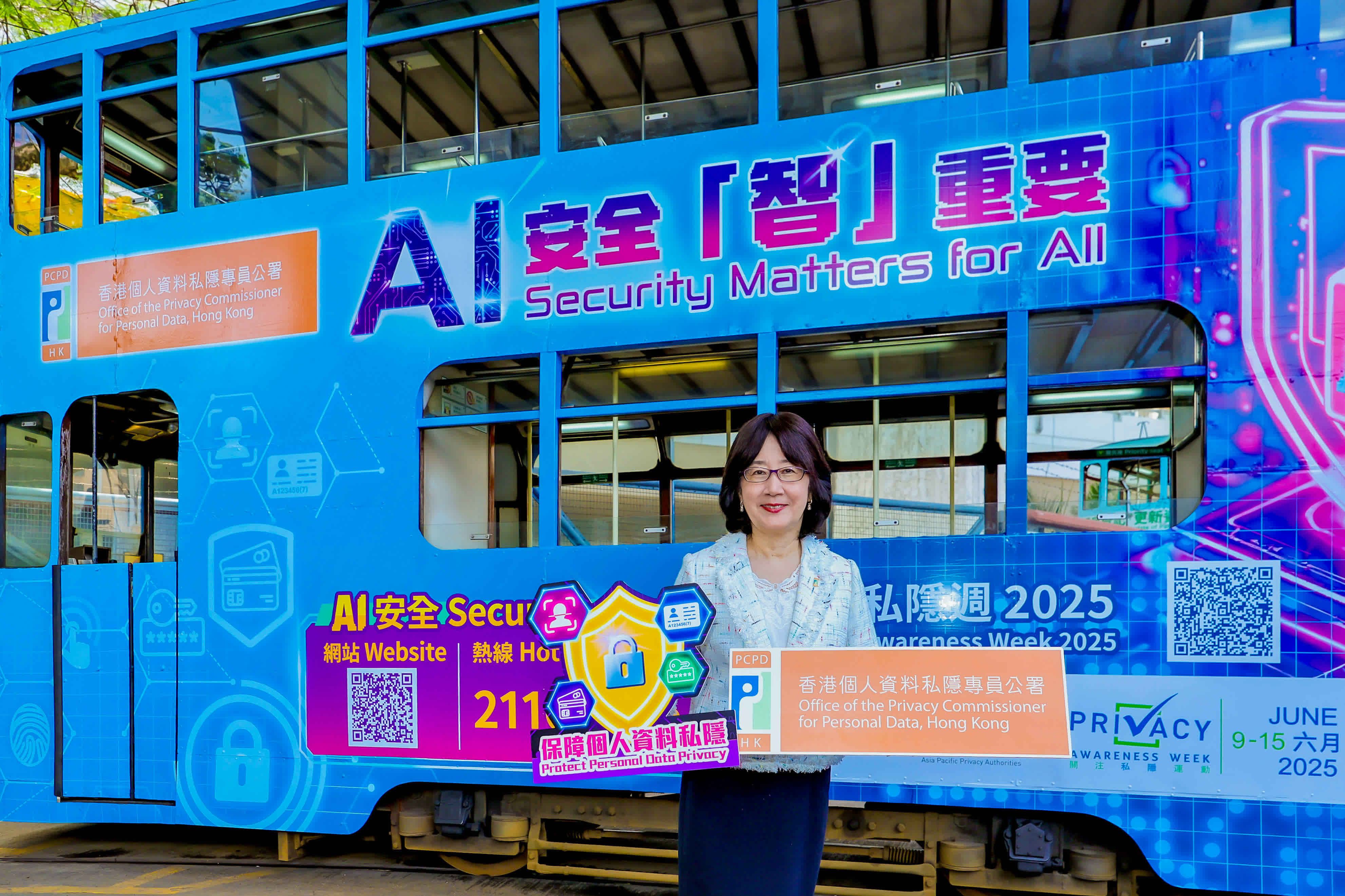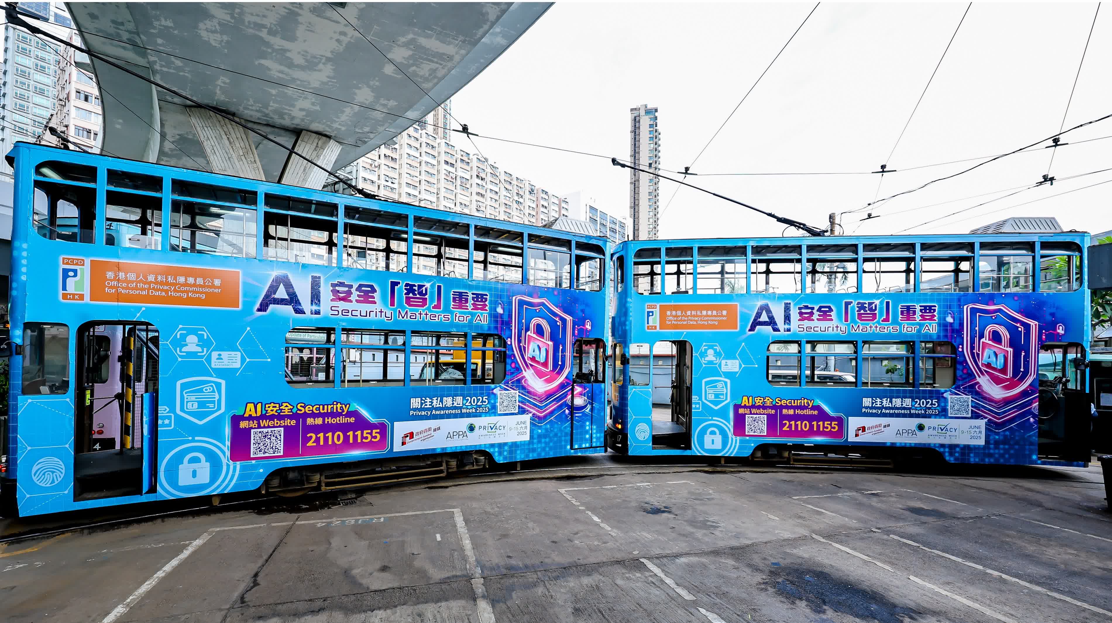 為提升市民對AI安全的意識,私隱專員公署由即日起至7月4日期間,推出「AI安全『智』重要」主題電車,進行巡迴宣傳。主題電車的設計以象徵「AI安全」的鎖為重點,結合與個人資料相關的不同圖標,並加上「AI安全」熱線(2110 1155)及全新推出的「人工智能安全」專題網站的二維碼,方便公眾了解有關資訊。