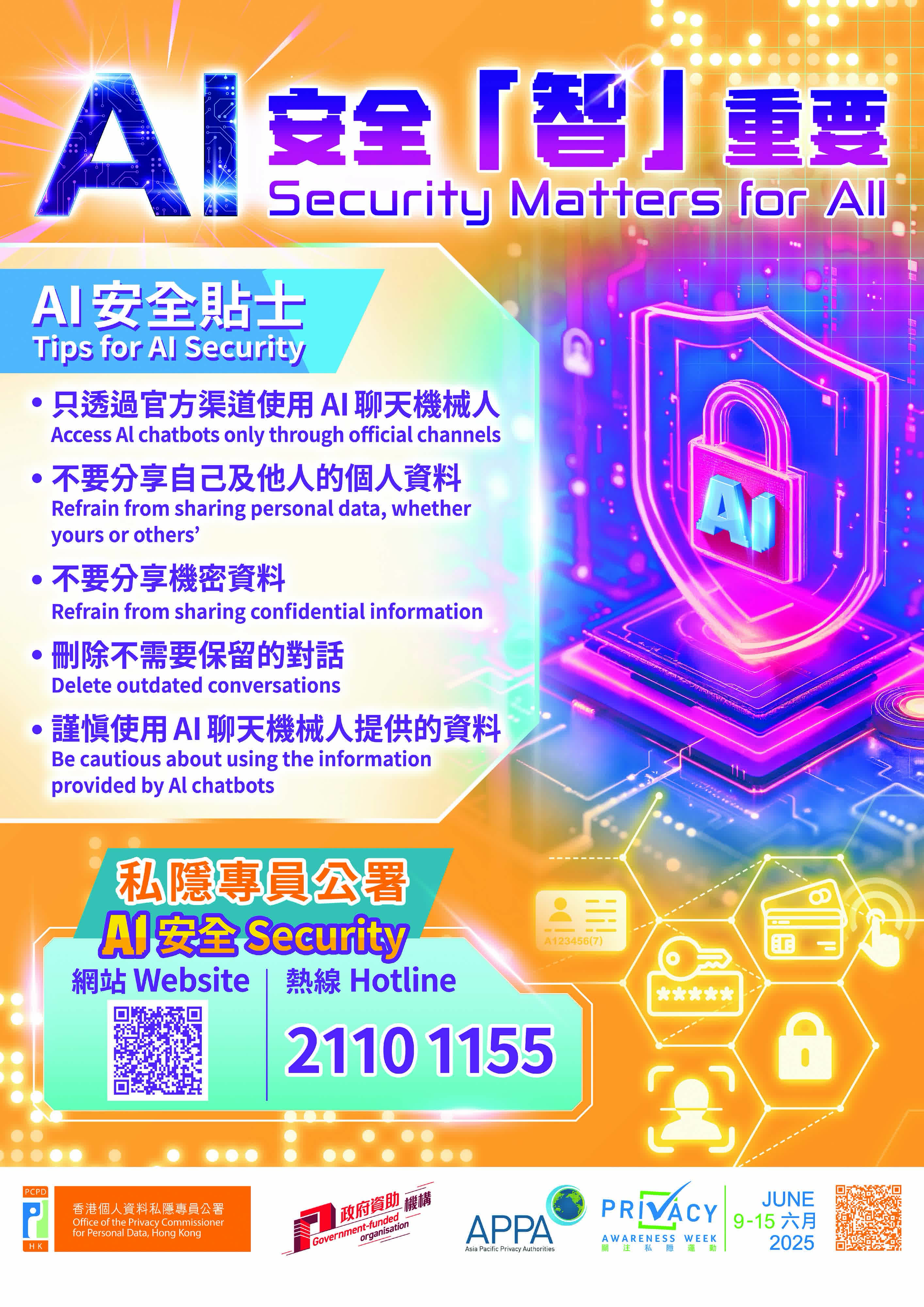 此外,私隱專員公署亦會向政府部門、各區民政事務處、社區中心、商會、不同機構、學校以及公署保障資料主任聯會會員等派發「關注私隱週2025」海報,向社會各界推廣AI安全的重要性。