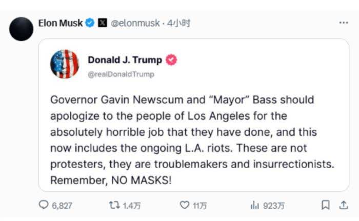 隨後,馬斯克還轉發了多條特朗普在其自創社交平台上發布的有關「洛杉磯騷亂」的帖文和截圖。有分析稱,這表示了馬斯克在該事件中對美國聯邦政府的聲援。