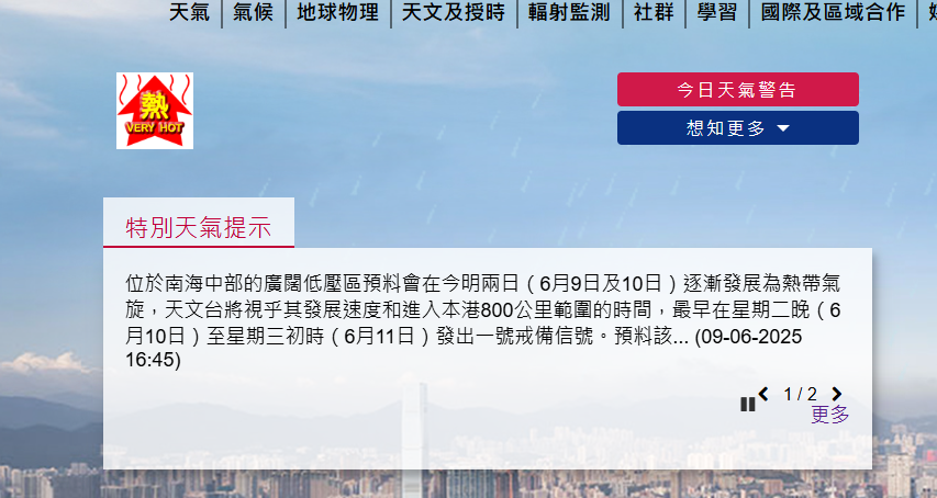大公文匯全媒體報道,天文台今日(9日)發布最新特別天氣提示表示,位於南海中部的廣闊低壓區預料會在今明兩日(9日至10日)逐漸發展為熱帶氣旋,天文台將視乎其發展速度和進入本港800公里範圍的時間,最早在星期二晚(10日)至星期三初時(11日)發出一號戒備信號。