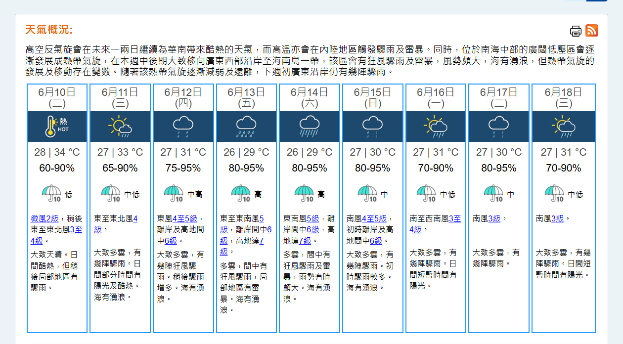 天文台表示,預料該熱帶氣旋在本周中後期大致移向廣東西部沿岸至海南島一帶,天文台會視乎其與本港的距離和發展速度,評估是否需要在星期三稍後至星期四(12日)改發更高熱帶氣旋警告信號。本港未來一兩日持續酷熱,但隨着該熱帶氣旋靠近,本周後期風勢頗大,間中有狂風驟雨,海有湧浪。