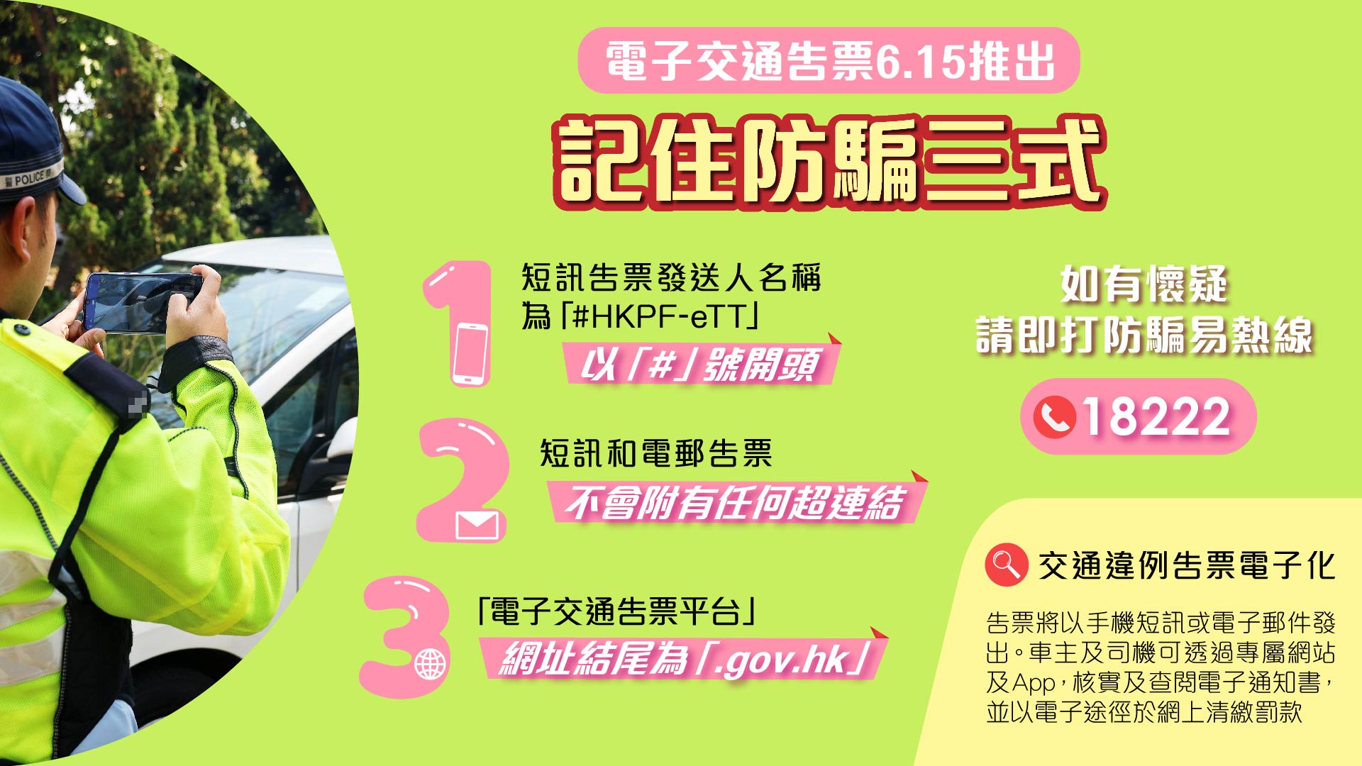 交通告票電子化由6月15日起實施,電子告票將以流動電話短訊或電郵,發送給違規車主或司機。同時,「電子交通告票平台」網站及流動應用程式亦會推出,讓車主及司機查閱電子告票,並透過電子方式繳付罰款。