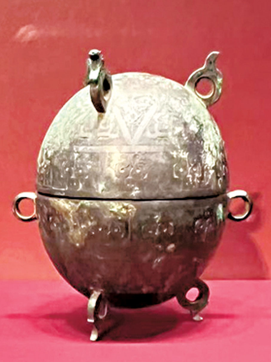 首都博物館還特地拿出了館藏文物變形虺紋銅敦,動畫電影《哪吒之魔童鬧海》中玉虛宮天元鼎渾圓的造型就來自這件戰國銅敦。「敦是古代盛放食物的器物,曾是王族餐桌上的奢侈品。」高紅清指出,一同展出的銅鐃、銅觚、陶觚,對應了電影中哪吒生辰宴上的樂器和酒具。
