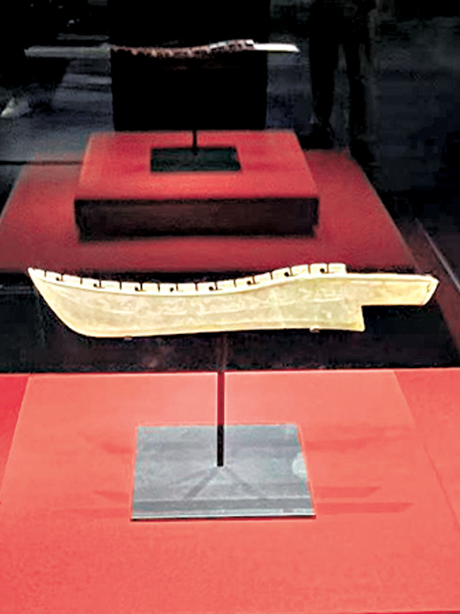 記者注意到,一件墨綠色的商代玉刀獨享一個展櫃,它是龍王敖光劈開東海的「龍牙刀」。相比敖光高大帥氣的形象,這件小巧的玉刀自帶「反差萌」,僅長約25厘米。商代匠人還在刀身兩面,各雕刻6個鸚鵡狀小鳥紋,盡顯手藝絕妙。據介紹,這把玉刀與牛尊同樣出土於殷墟遺址亞長墓,仿同時期銅刀所製,刀刃兩面磨製,較鋒利,無使用痕跡,推測作為古代貴族的隨身佩飾,不僅象徵着墓主人的尊貴身份,更在某種程度上折射出當時社會的文化風貌。