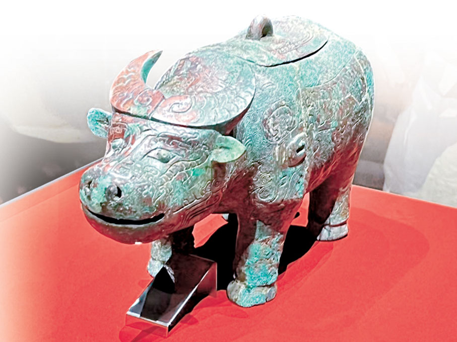 商代是青銅器鑄造技藝的一大巔峰時期。佔據展廳「C位」的就是殷墟博物館鎮館之寶——亞長牛尊。牛尊是商代將軍「亞長」的隨葬品,造型為一頭寫實的水牛,抬頭伸頸,微張口,口內中空,背部微凹,上有長方形銅蓋,整體造型精美可愛。其全身布滿龍、鳥、魚等動物紋飾,牛腹兩側還各有一隻猛虎。據介紹,這是殷墟出土的唯一一件牛形青銅容器,原型是商代的野生水牛——聖水牛。在殷商人的觀念中,未被馴化的聖水牛野性十足,讓人心生敬畏,從而模仿、製作其形象,甚至加以崇拜。