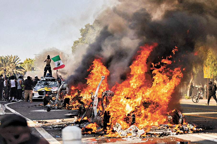 香港文匯報綜合報道,美國加州洛杉磯搜捕非法移民引發的騷亂升級,總統特朗普頒令向洛杉磯派遣2,000名國民警衛隊人員,首批約300人周日(6月8日)進駐當地,與示威者爆發激烈衝突。美軍另有約500名海軍陸戰隊隊員已經待命,隨時部署到洛杉磯。特朗普揚言要「解放」洛杉磯,以強硬手段確保當地恢復法治。加州州長紐瑟姆則斥責特朗普侵犯加州州權,加劇緊張局勢。