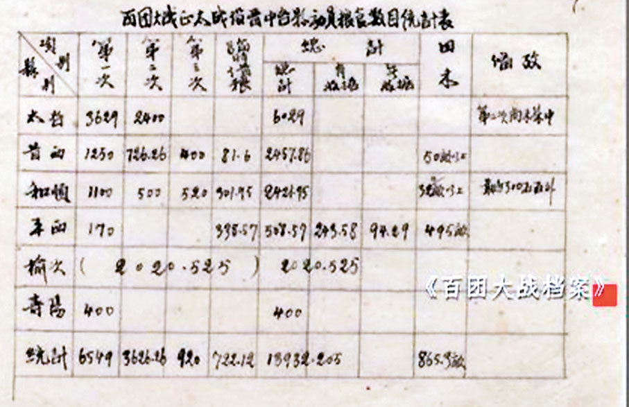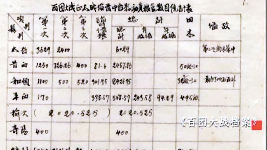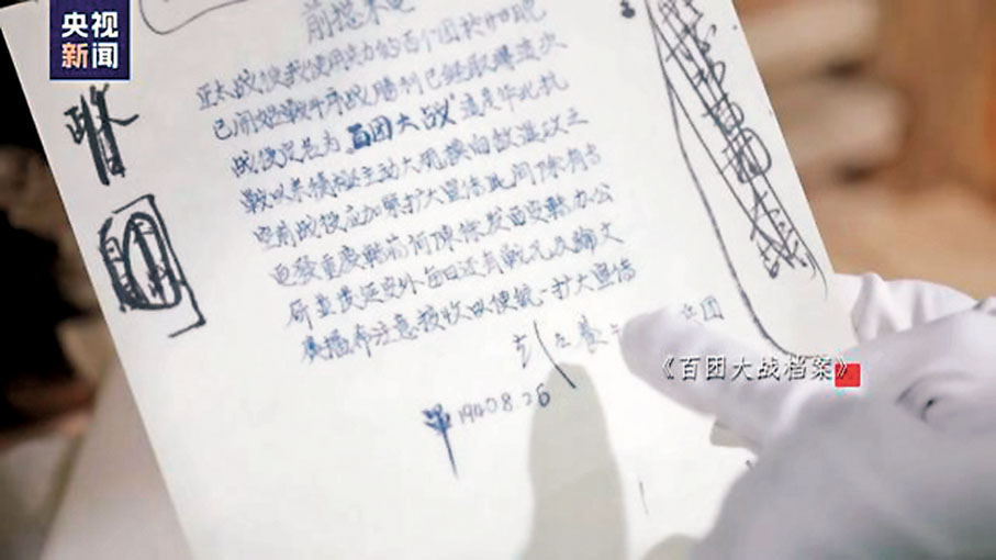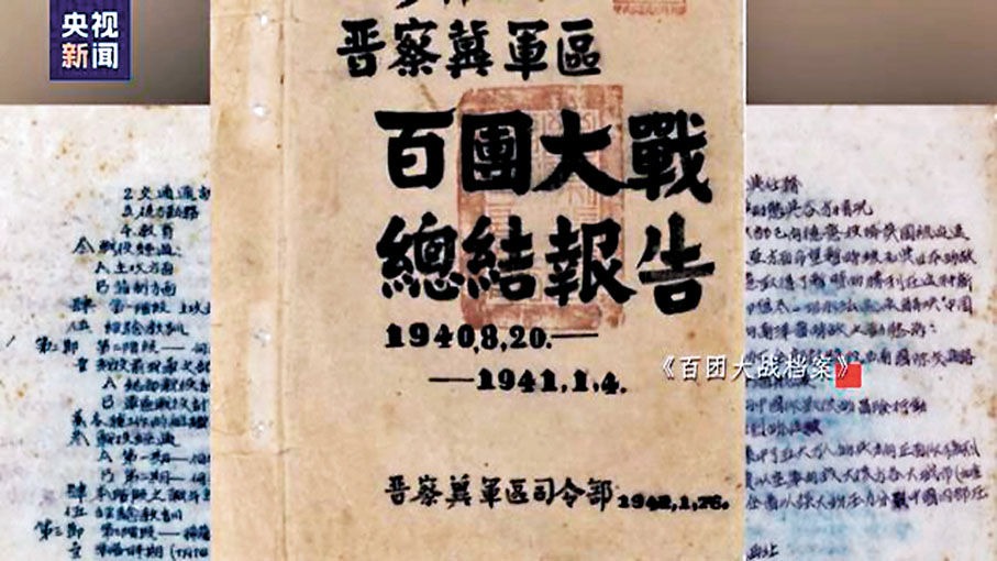 據介紹,《百團大戰檔案》共33件,詳細梳理了百團大戰的指揮命令、戰役部署、前線戰報和戰役總結。1940年,中國抗日戰爭進入最艱苦的相持階段。日寇準備實行南進政策,加緊誘迫國民黨投降,把進攻的矛頭全面指向八路軍,企圖摧毀華北抗日根據地。1940年8月到1941年1月,八路軍在華北敵後發動大規模進攻和反「掃蕩」戰役,痛擊日寇囂張氣焰。當時105個團20餘萬人參戰,共作戰1,824次,斃傷日軍2萬餘人、偽軍5,000餘人,俘日軍280餘人、偽軍1.8萬餘人,「百團大戰」一戰成名。