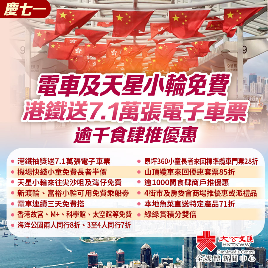 另外,將有超過1000間食肆及商戶在七一提供優惠;食環署4個街市及房委會商場推出優惠或派發禮品;由7月1日至7日,在本地魚菜直送網站或手機APP買特定產品有71折;7月1日到環保署綠在區區回收,綠綠賞積分雙倍。