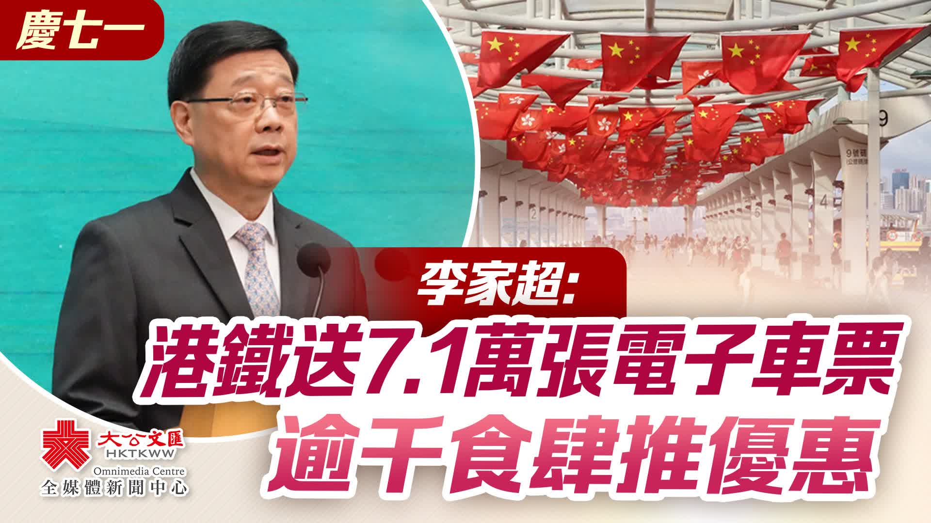 李家超還指出,多個政府場地免費,康文署多個室內戶外康樂設施,科學館、太空館的常設展覽,香港濕地公園、香港故宮文化博物館專題展覽、M+標準票展覽全部免費開放;海洋公園推出成人門票優惠,7月3日或之前到海洋公園,兩人同行8折,3至4人同行7折;七一當日昂坪360小童及長者來回標準纜車門票28折,山頂纜車來回優惠套票85折。
